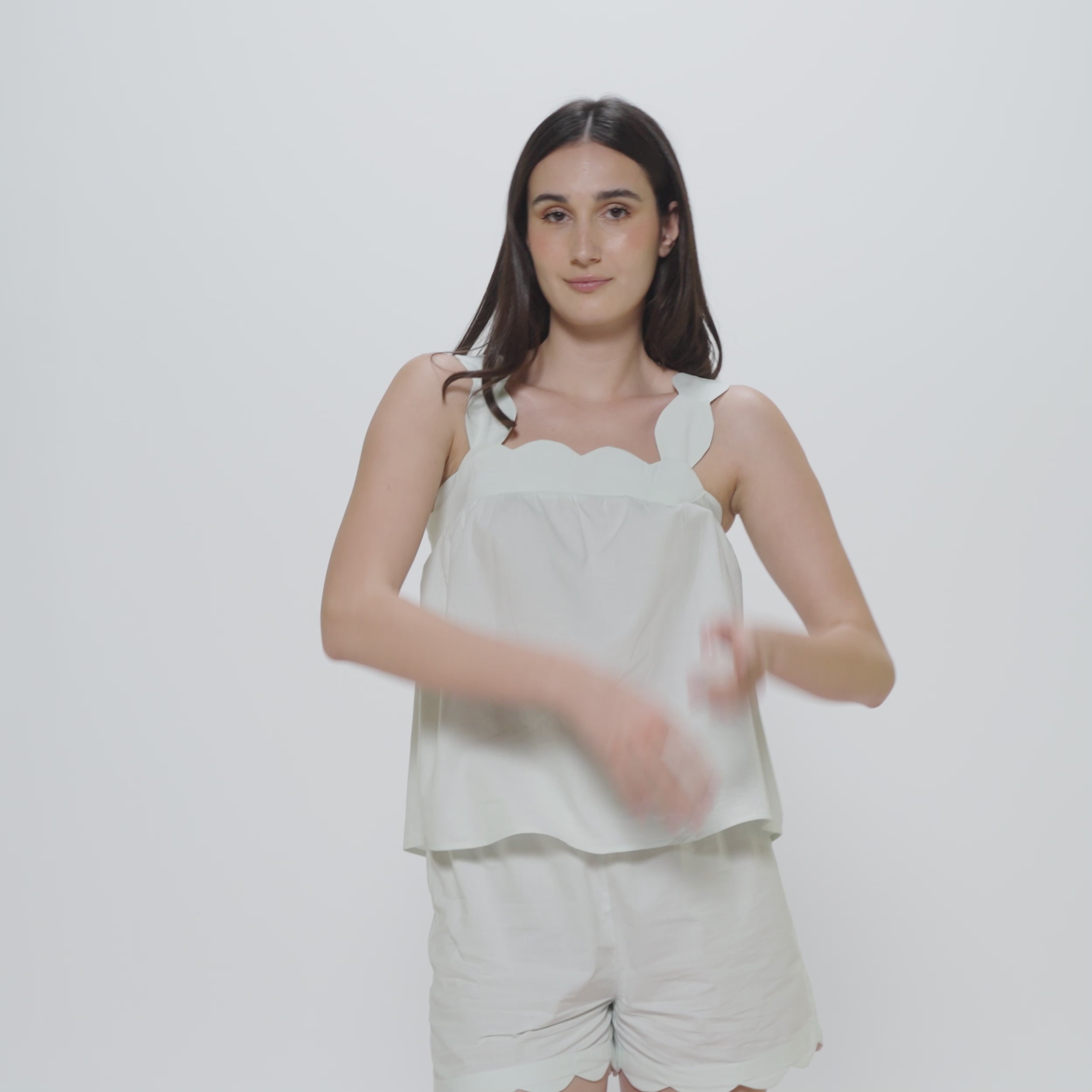 توب قطن بحواف مموجة يتميز بخفة وأناقة صيفية، مع حمالات عريضة وزمات ناعمة عند الصدر تضيف مظهرًا أنثويًا جميلاً، وتمنح الحواف المتموجة التصميم لمسة مرحة ولطيفة.