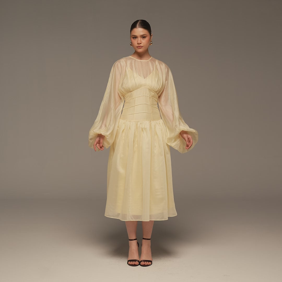 فستان أصفر فاتح أورجانزا بأكمام منفوخة