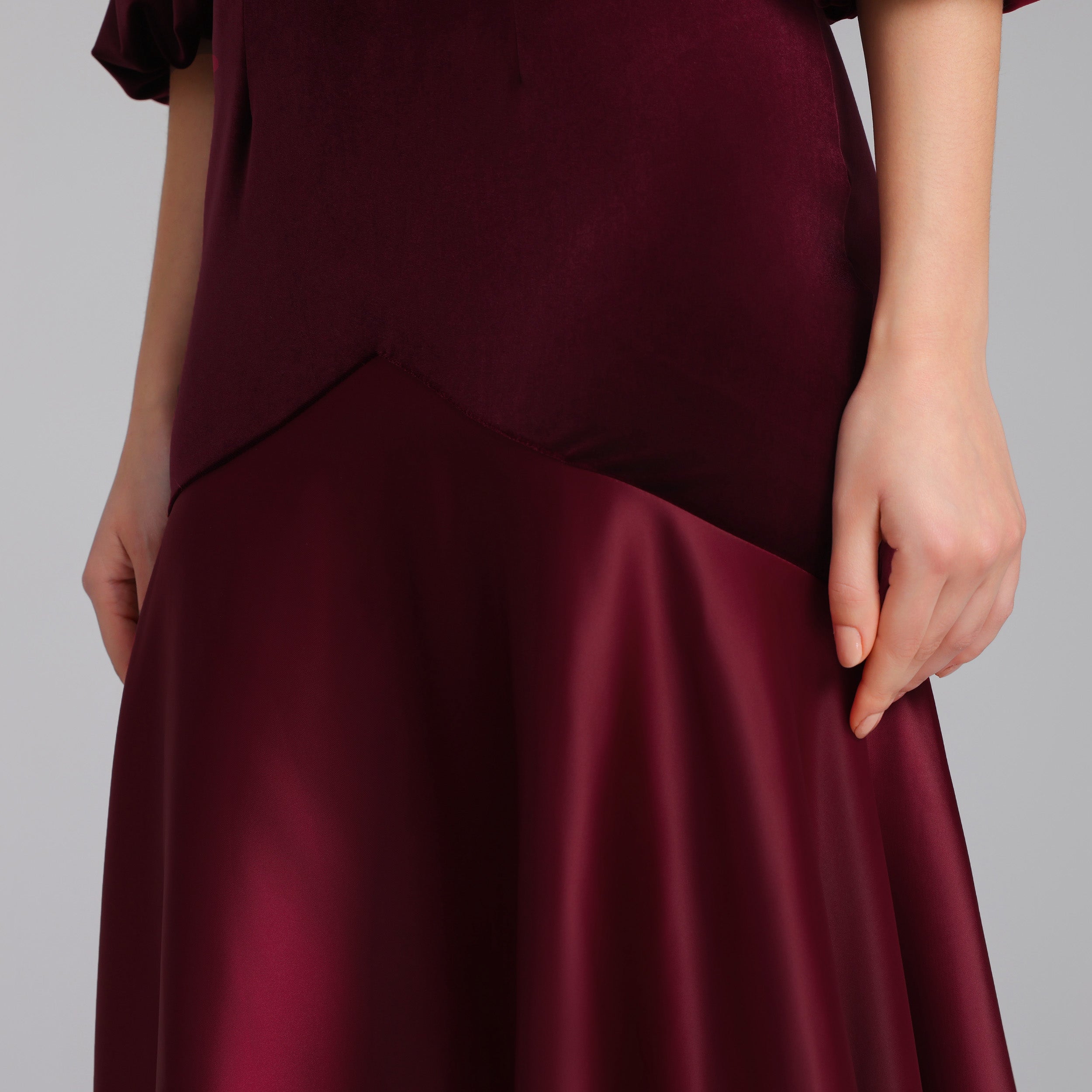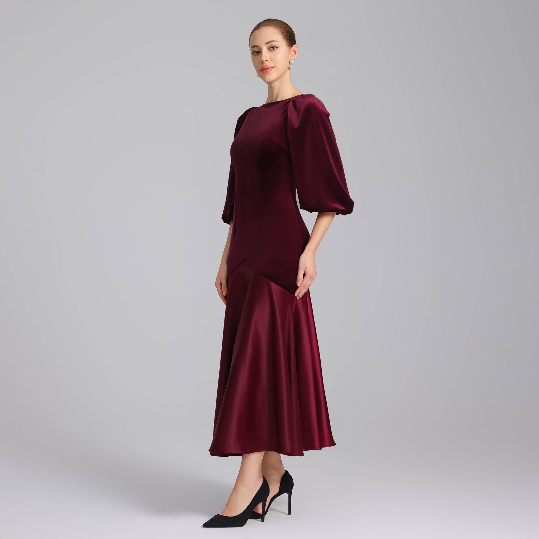 فستان ميدي يجمع المخمل الاسترتش في الجزء العلوي والساتان في التنورة بتباين ناعم في الخامات يضفي توازنًا للإطلالة. يتميز بياقة مستديرة وأكمام طويلة منتفخة تضيف لمسة أنثوية، بينما توفر التنورة الواسعة حرية حركة وانسيابية. تصميم يناسب من تبحث عن مظهر متزن وأنيق بلمسة معاصرة.
