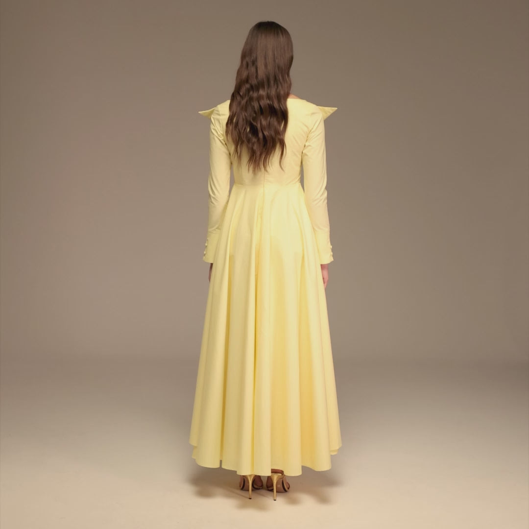 فستان ماكسي أصفر بأكمام طويلة وياقة V واسعة