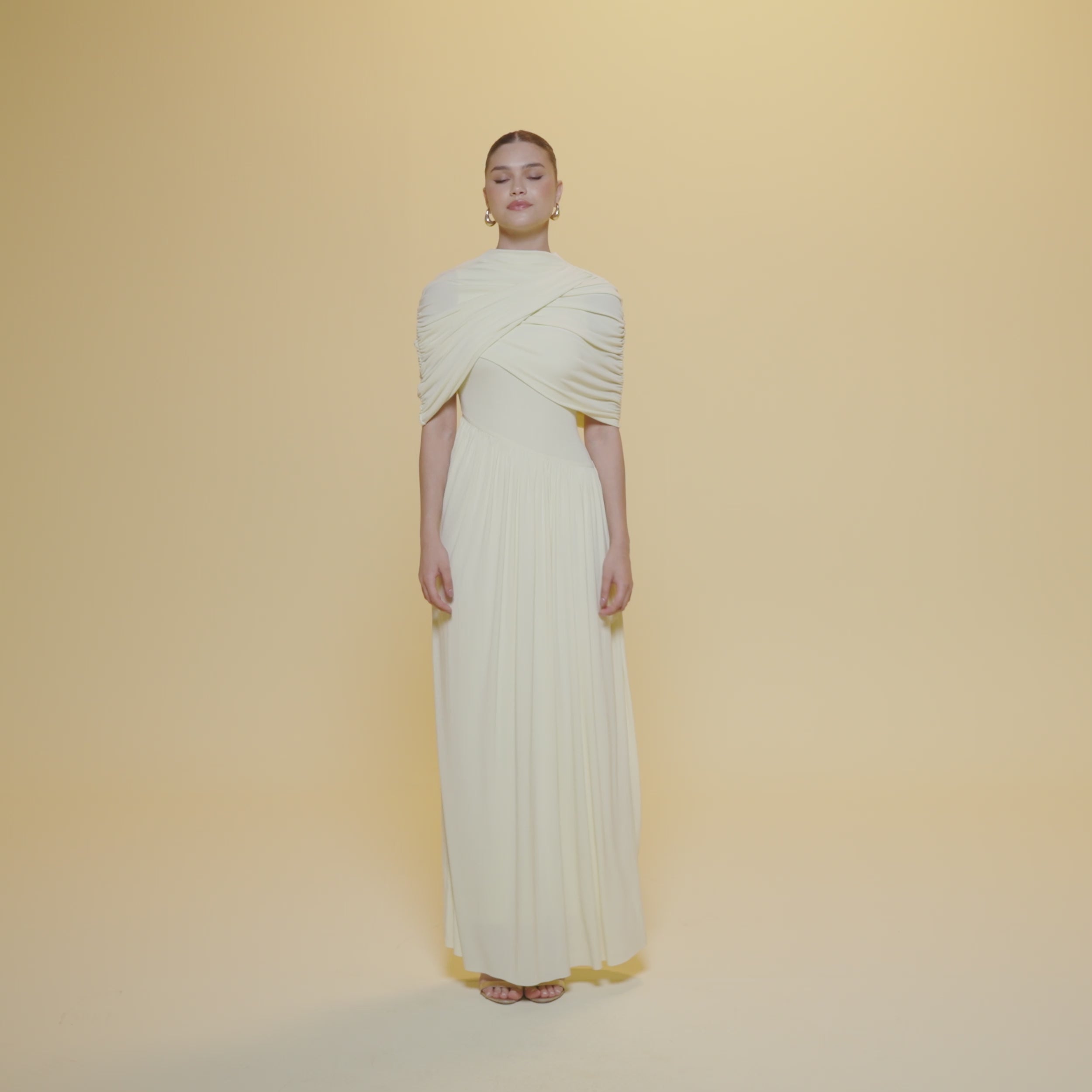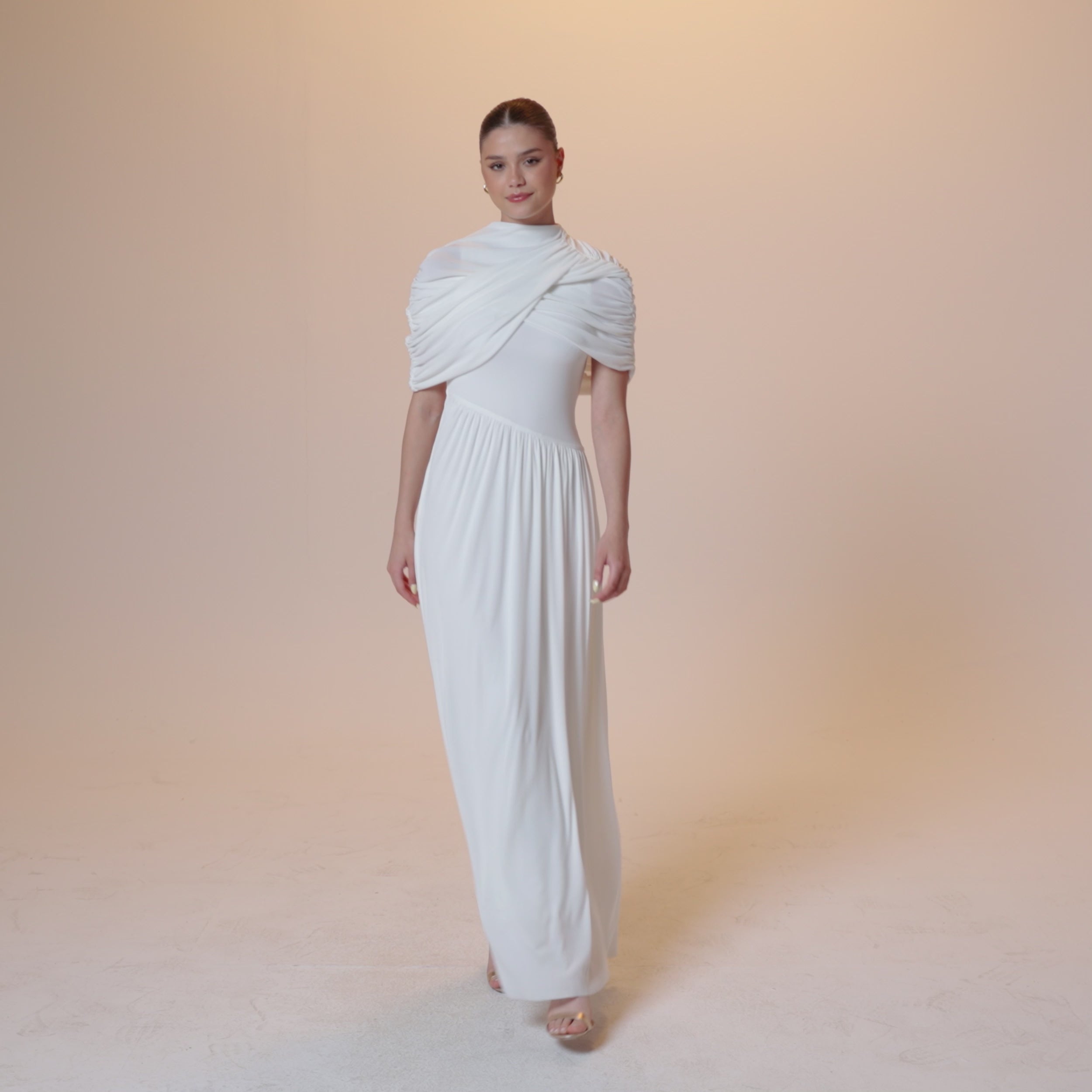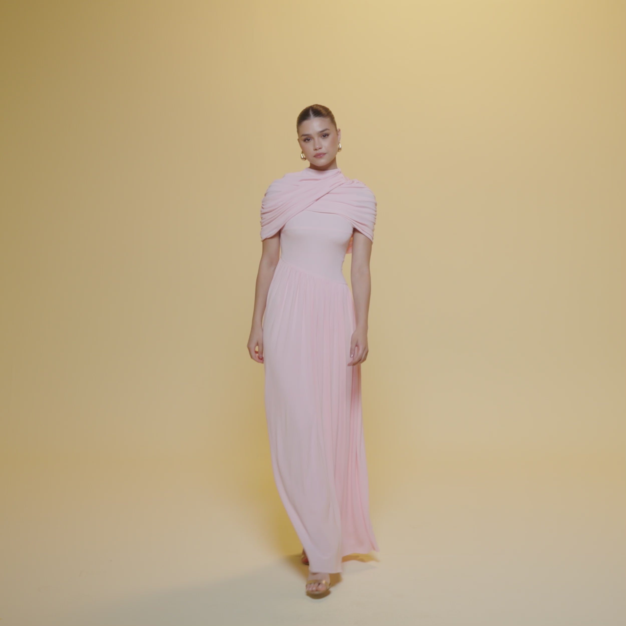 فستان ماكسي جيرسي بأكمام درابيه تنسدل بخفة على الكتفين، وتنورة بليسيه تضيف اتساعًا خفيفًا للقصة المستقيمة. تعطي الياقة المرتفعة والثنيات على الصدر توازنًا للتصميم في الجزء العلوي، ما يجعله مناسبًا لمن تبحث عن تغطية ناعمة مع طابع عصري أنيق.