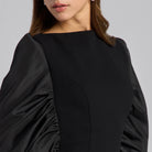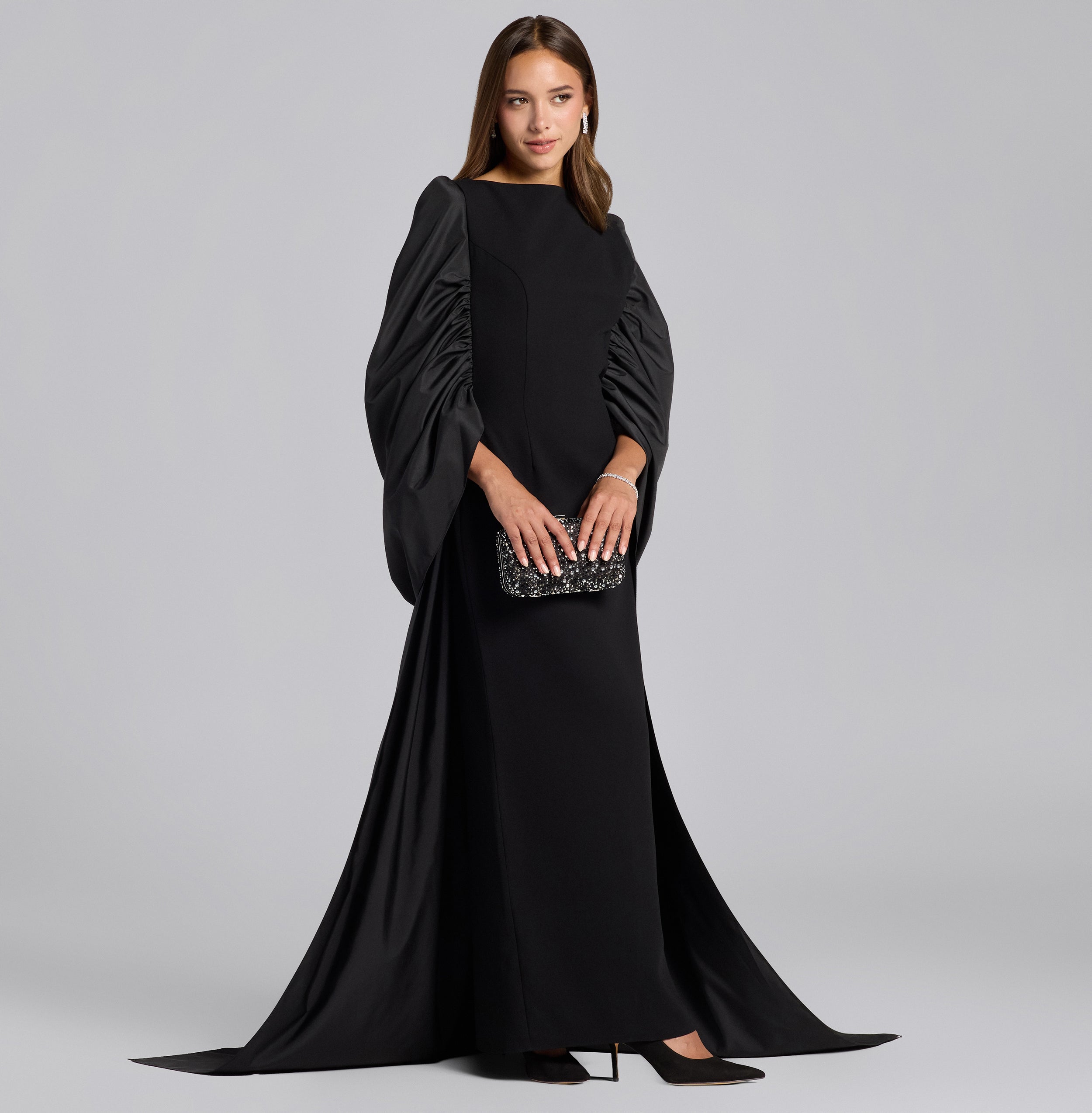 Elevate your evening wardrobe with this striking black crepe-taffeta gown, where refined elegance meets dramatic flair. The luxurious blend of crepe and taffeta fabrics creates a sophisticated silhouette with graceful movement, while the flowing back shawl adds an enchanting layer of drama and dimension. Perfect for formal occasions, galas, and upscale events, this timeless piece exudes understated luxury and contemporary style. The interplay of textures ensures you'll command attention with effortless grace.