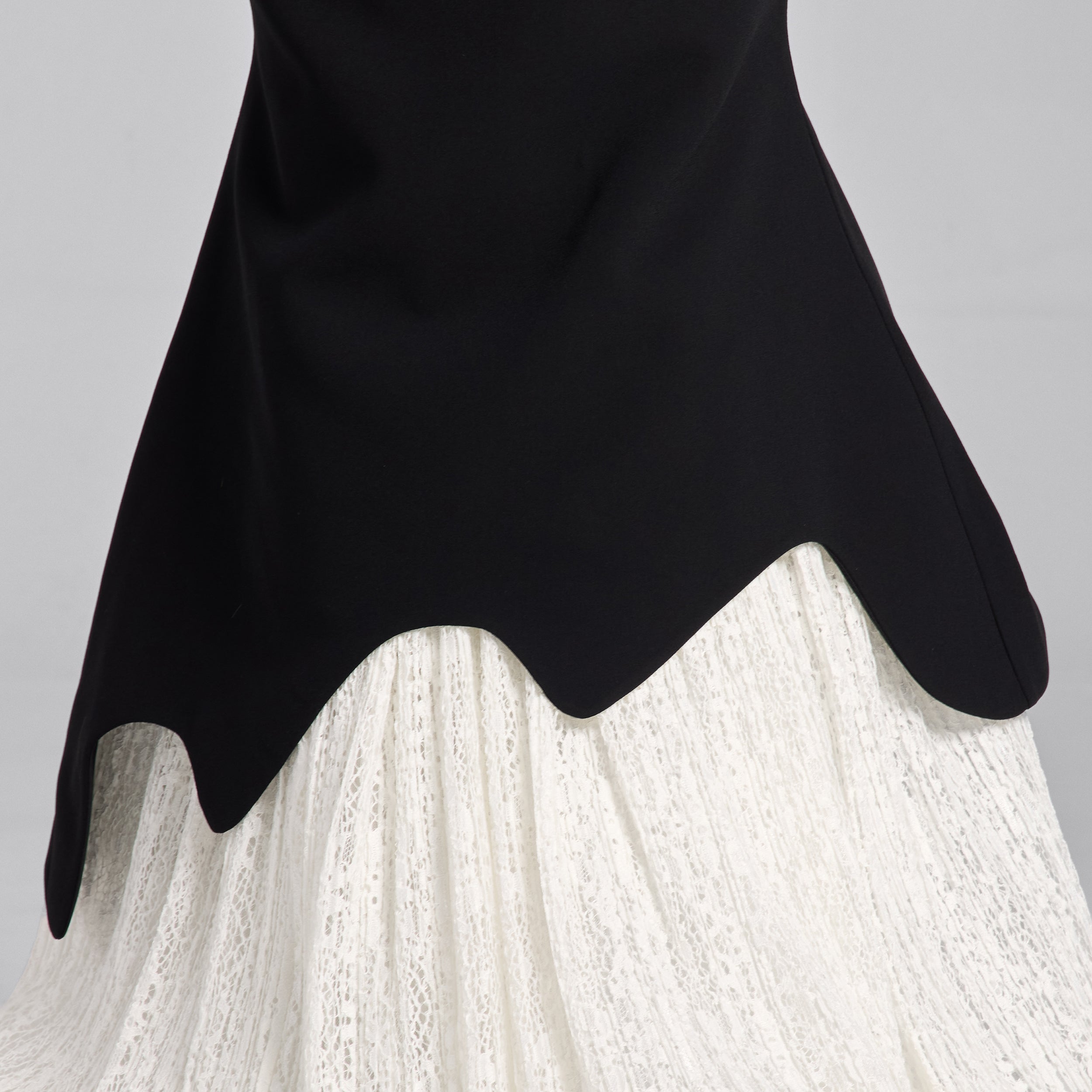 Elevate your evening with this striking Black & White Crepe-Lace Mermaid Gown, a masterpiece of refined elegance. The luxurious crepe fabric drapes beautifully while delicate lace detailing adds timeless sophistication. The classic mermaid silhouette hugs your curves gracefully before flowing into an elegant train, creating a dramatic and flattering look. Perfect for galas, formal events, or unforgettable celebrations, this gown combines contemporary design with enduring style. A statement piece that commands attention and exudes confidence.