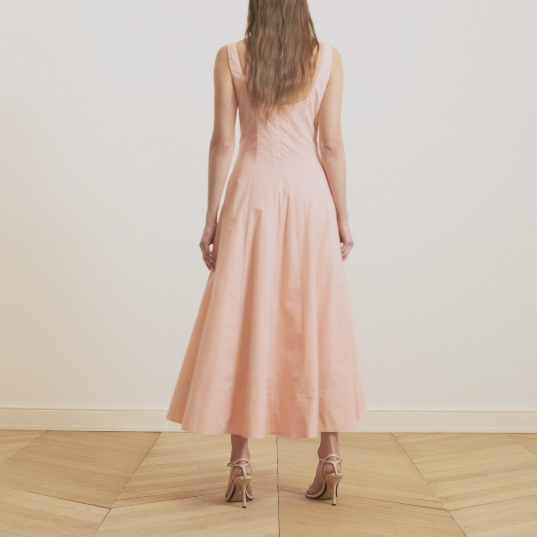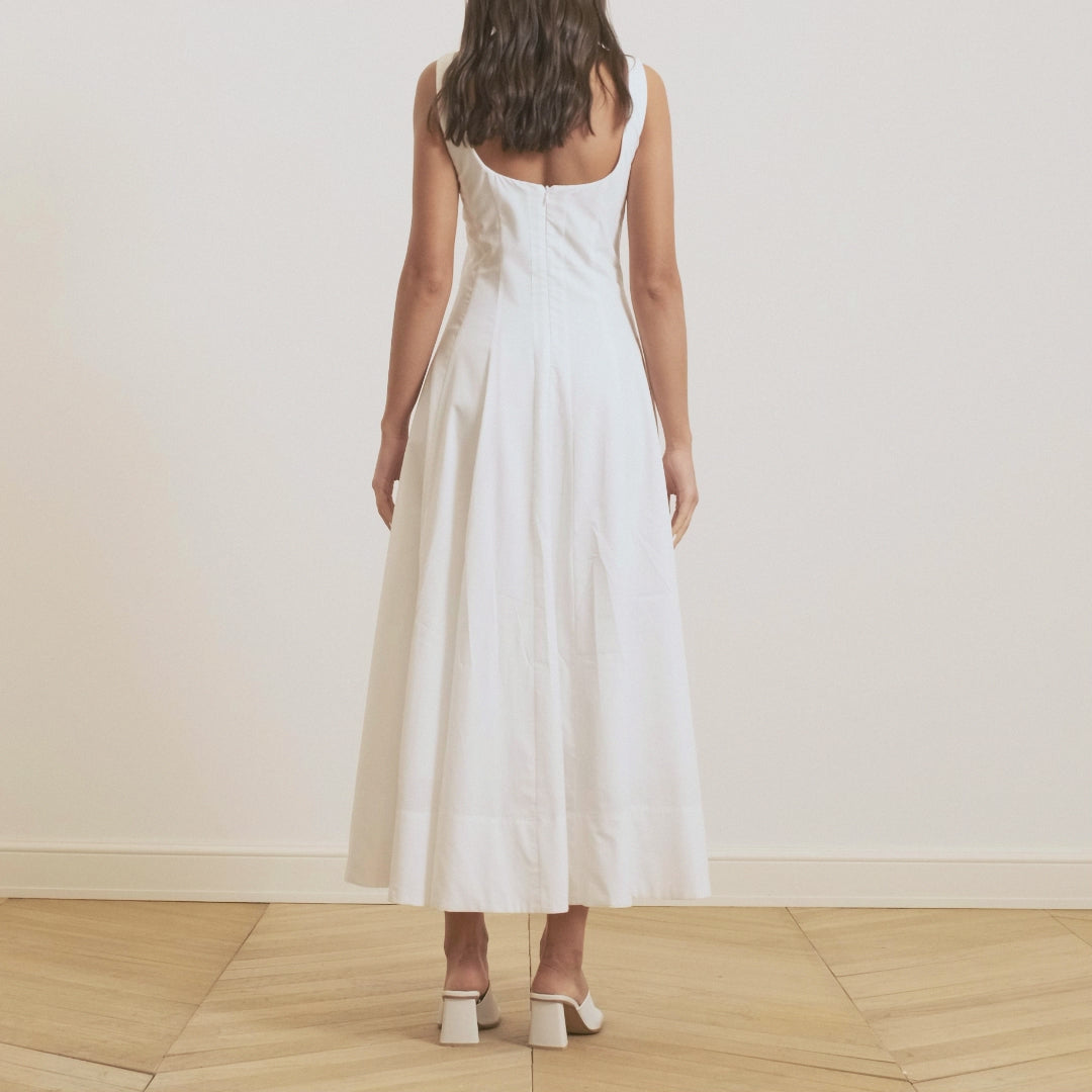 تجتمع البساطة والأنوثة في هذا الفستان الكورسيه بتصميمه الصيفي وقماشه المصنوع من القطن الطبيعي. تمنحك تنورته الواسعة مظهراً إنسيابياً أنيقاً، ويحدد خصره الضيق جسمك في شكل يحقق توازن الإطلالة وجمالها.