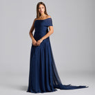 Elevate your evening wardrobe with this sophisticated navy chiffon gown, designed to captivate. The expertly ruched bodice creates a flattering silhouette while the flowing chiffon fabric drapes with effortless elegance. A striking back scarf adds an unexpected dramatic element, transforming this piece into a statement-making ensemble perfect for galas, weddings, and formal occasions. The combination of refined tailoring and graceful movement ensures you'll command attention with understated luxury.