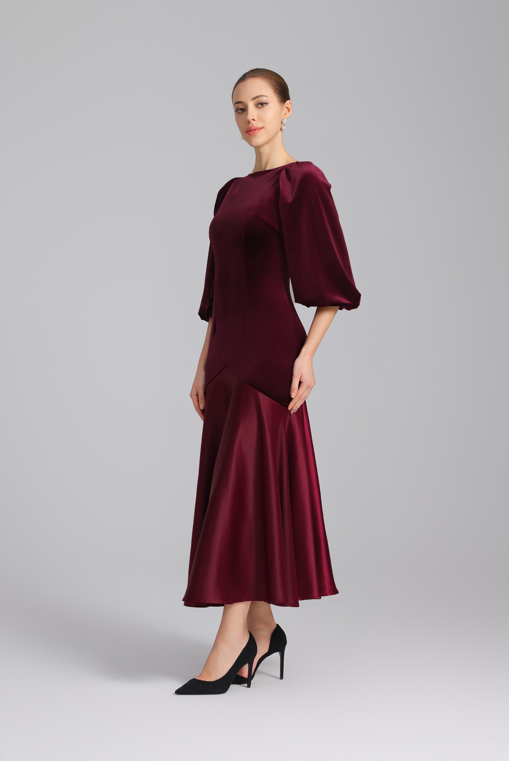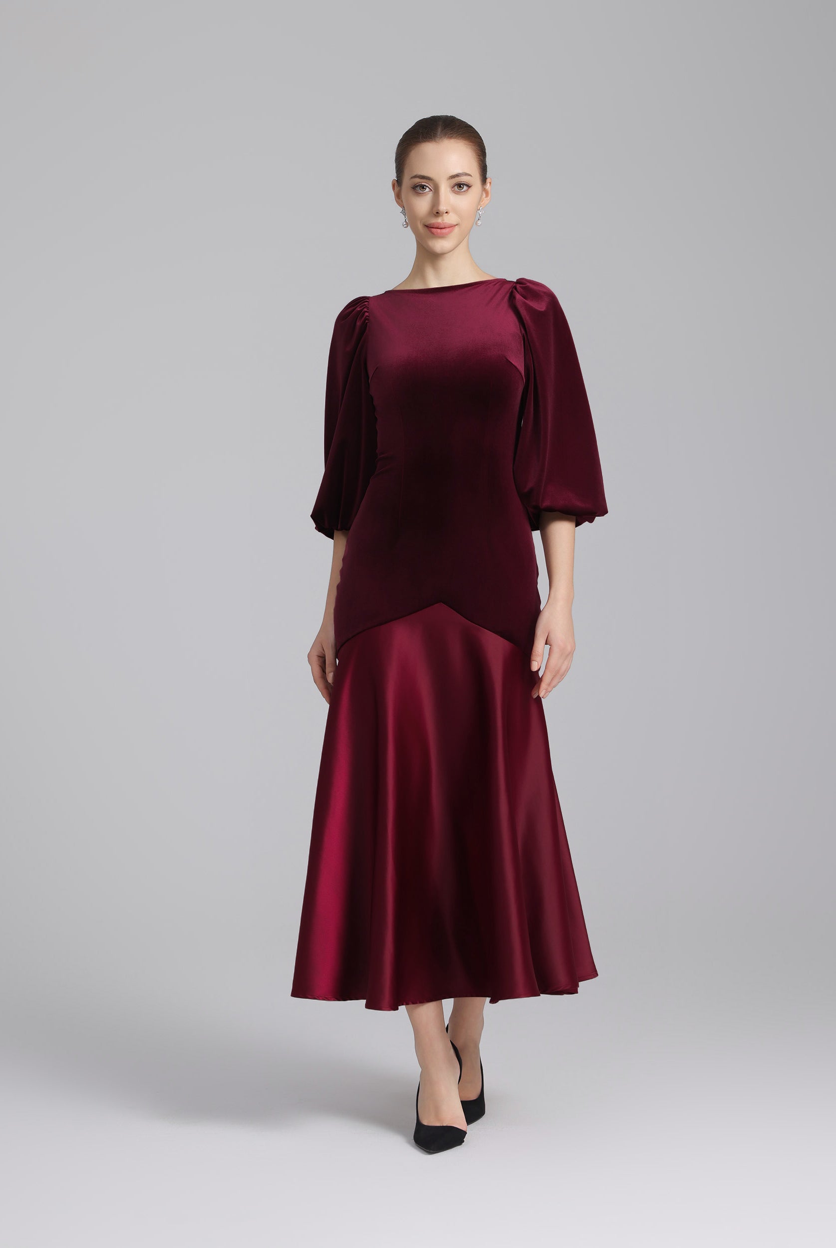 فستان مخمل وشيفون برغندي بدون أكمام مع وشاح