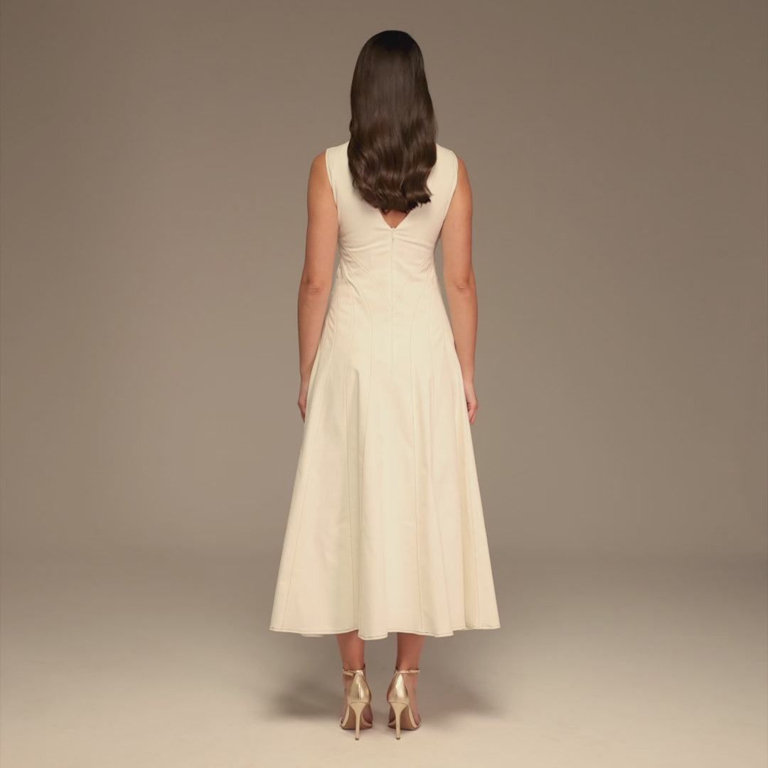 Cut from crisp cotton, this sleeveless midi dress is shaped with an A-line silhouette and subtle seam detailing to highlight the structure without feeling stiff. The wide boat neckline balances the open V-back, creating contrast between front and back. It’s the kind of piece that feels effortless, yet thoughtfully designed.