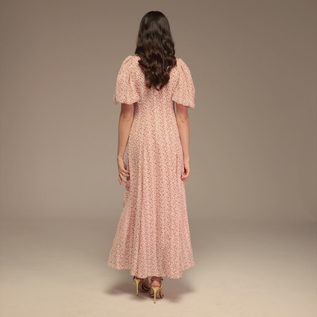 This floral maxi dress strikes a balance between volume and shape. The high neckline and short balloon sleeves add coverage without bulk, while the A-line silhouette ensures comfort and ease of movement. Floral embroidery along the dress adds dimension and a handcrafted feel that elevates the everyday.