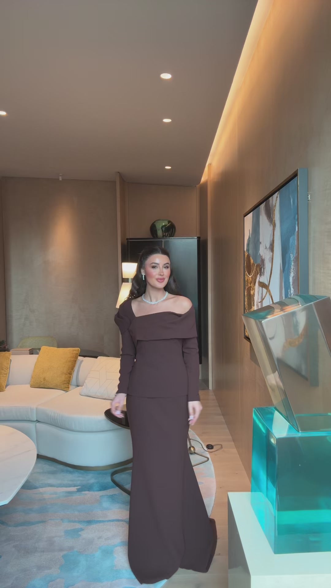 This off-shoulder gown gives you a soft, elegant look without much effort. The draped neckline highlights the shoulders beautifully, while the fitted crepe bodice adds gentle shape without feeling tight. The straight maxi skirt creates a clean, elongated line that suits formal dinners, engagements, and evening events.