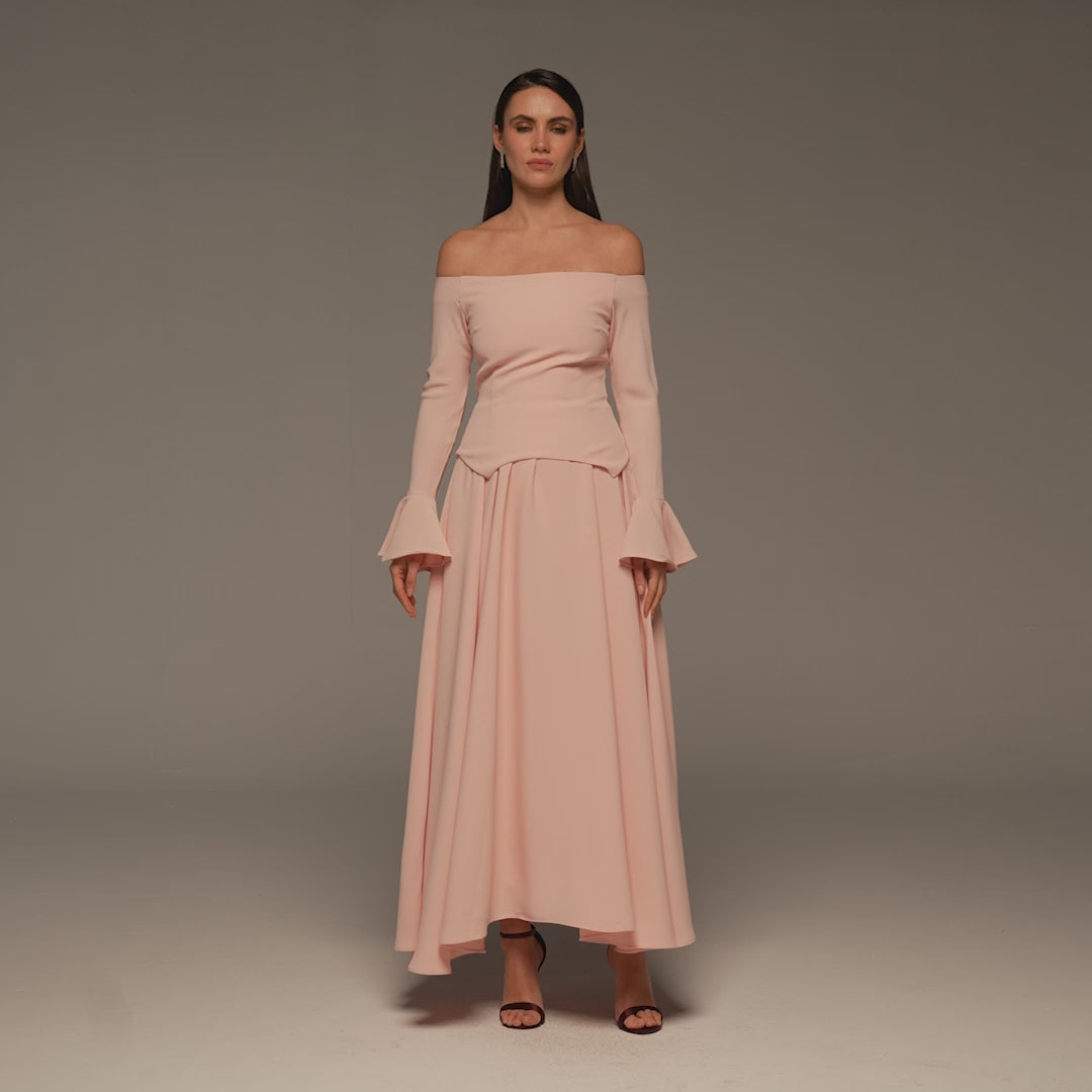 This pink off-shoulder crepe dress balances a clean neckline with soft movement through the skirt. The fitted upper shape defines the waist without feeling tight, while the flared cuffs add flow and ease to every step. A light, comfortable choice for Eid days that call for a polished yet relaxed look.