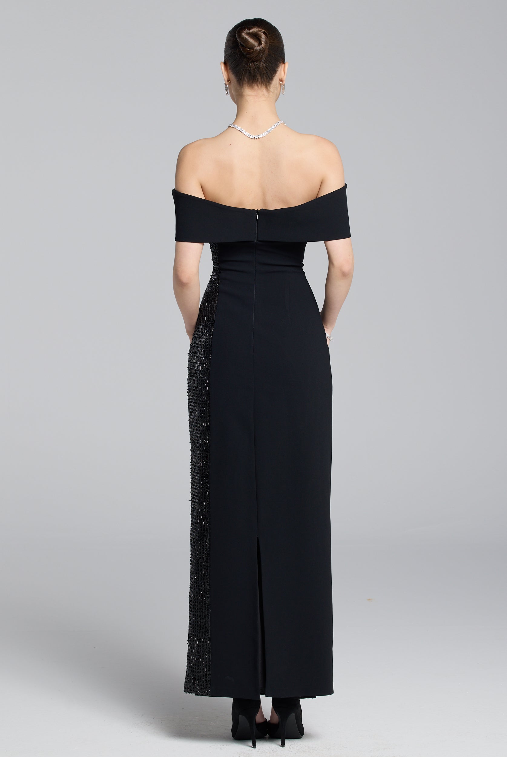 Black Crepe Off Shoulder Slit Maxi Dress
