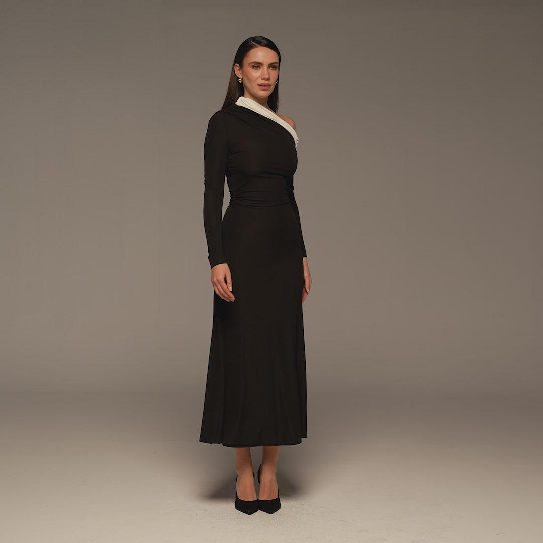 Made from soft jersey that gently follows your shape, this black and white off-shoulder ruched maxi dress drapes beautifully without feeling tight. The asymmetric neckline and ruched shoulder create a refined, flattering silhouette that feels as comfortable as it looks elegant – ideal for evening events, dinners, or special gatherings.