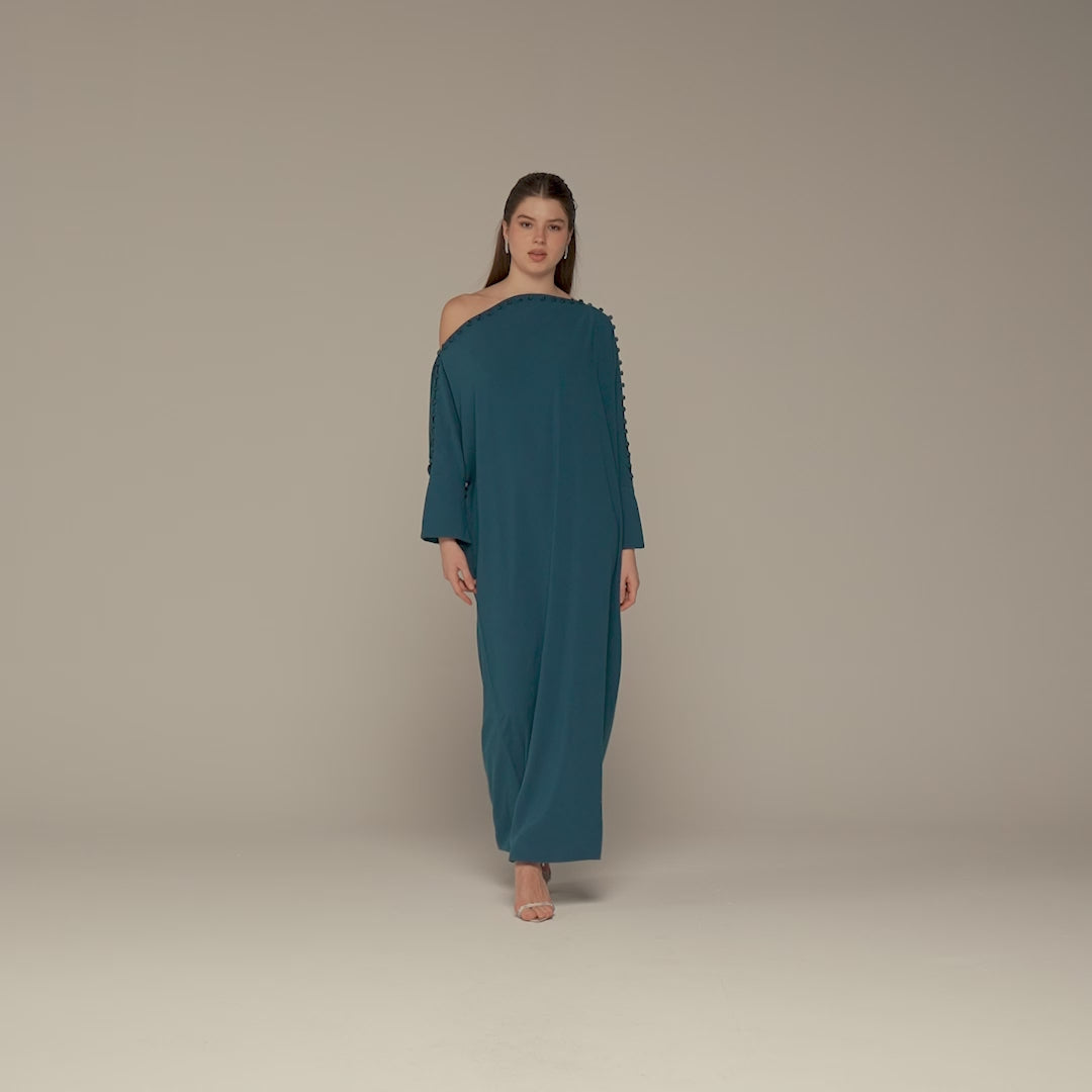 This asymmetric crepe kaftan offers a relaxed, flowy fit with a unique side-draped shape that feels comfortable while adding subtle structure. The shoulder button detailing draws the eye upward, giving a lifted effect without adding volume.