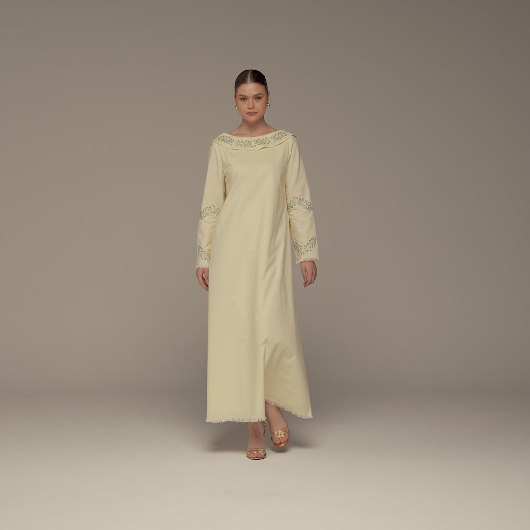 Butter Yellow Embroidered Neckline and Sleeve Linen Dress