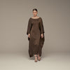 This satin maxi dress is made for evenings that call for quiet confidence. The smooth satin fabric falls fluidly over the body, creating a relaxed silhouette that feels comfortable without losing its shape. Subtle embroidery on the sleeves adds depth, making it suitable for dinners, gatherings, or formal occasions where ease matters.