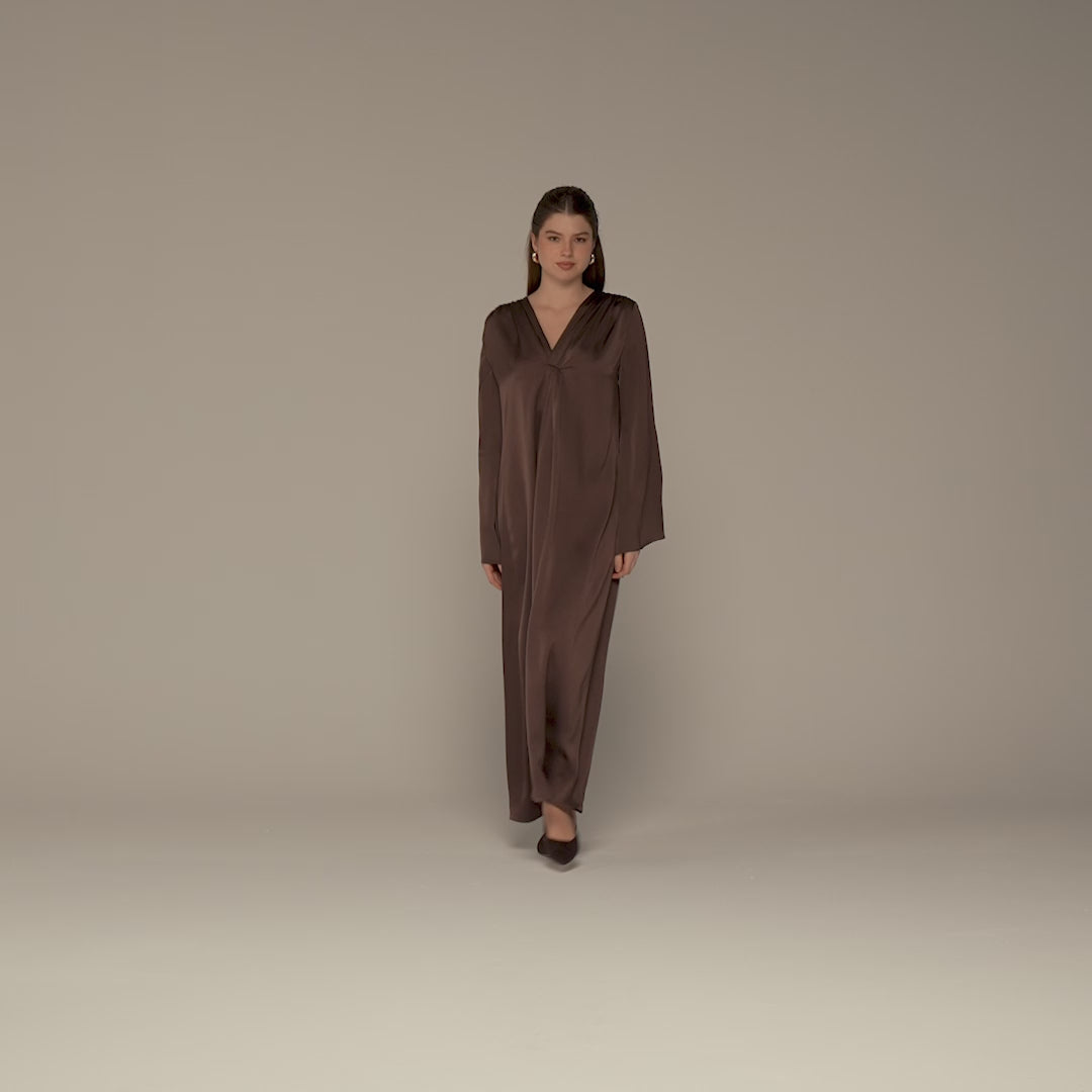 Dark Brown V-Neck Flared Sleeve Satin Kaftan