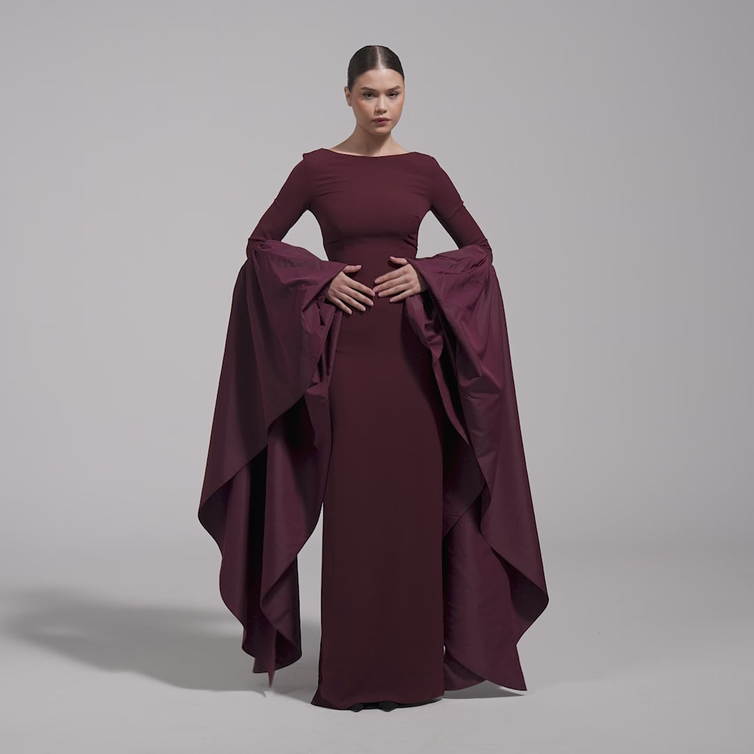 This dark plum fitted gown features elegantly extended sleeves that add a touch of sophistication to its sleek design. Tailored to enhance your silhouette, it offers a graceful and polished look, perfect for formal occasions where timeless style is paramount. The deep plum shade enriches your ensemble with subtle allure and refined charm.