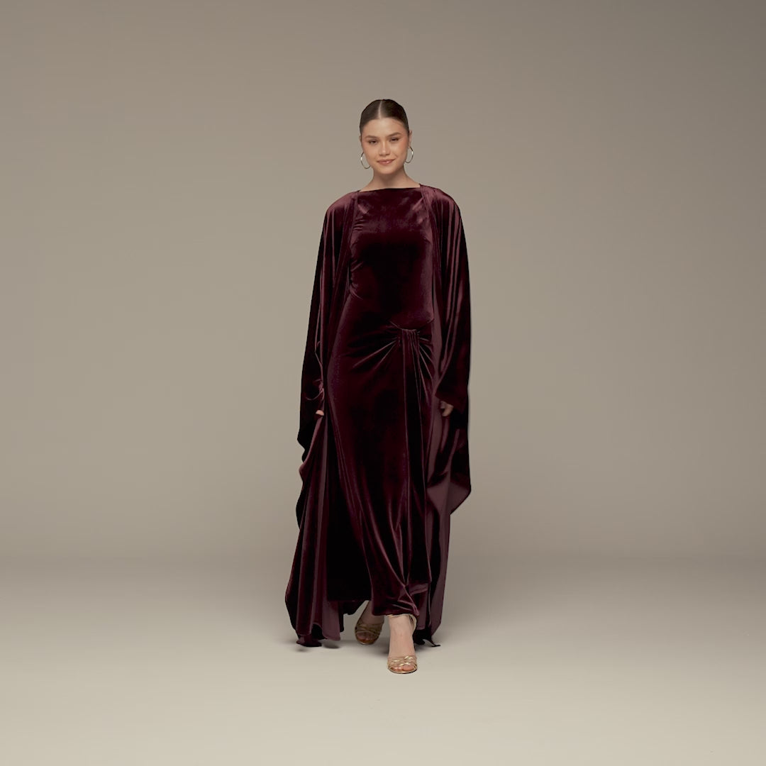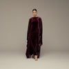 This burgundy velvet dress and draped cape set is designed to give a complete, polished look with minimal effort. The soft velvet falls smoothly over the body, while the cape adds coverage and movement without adding bulk. Ideal for Ramadan gatherings where comfort and presence matter equally.