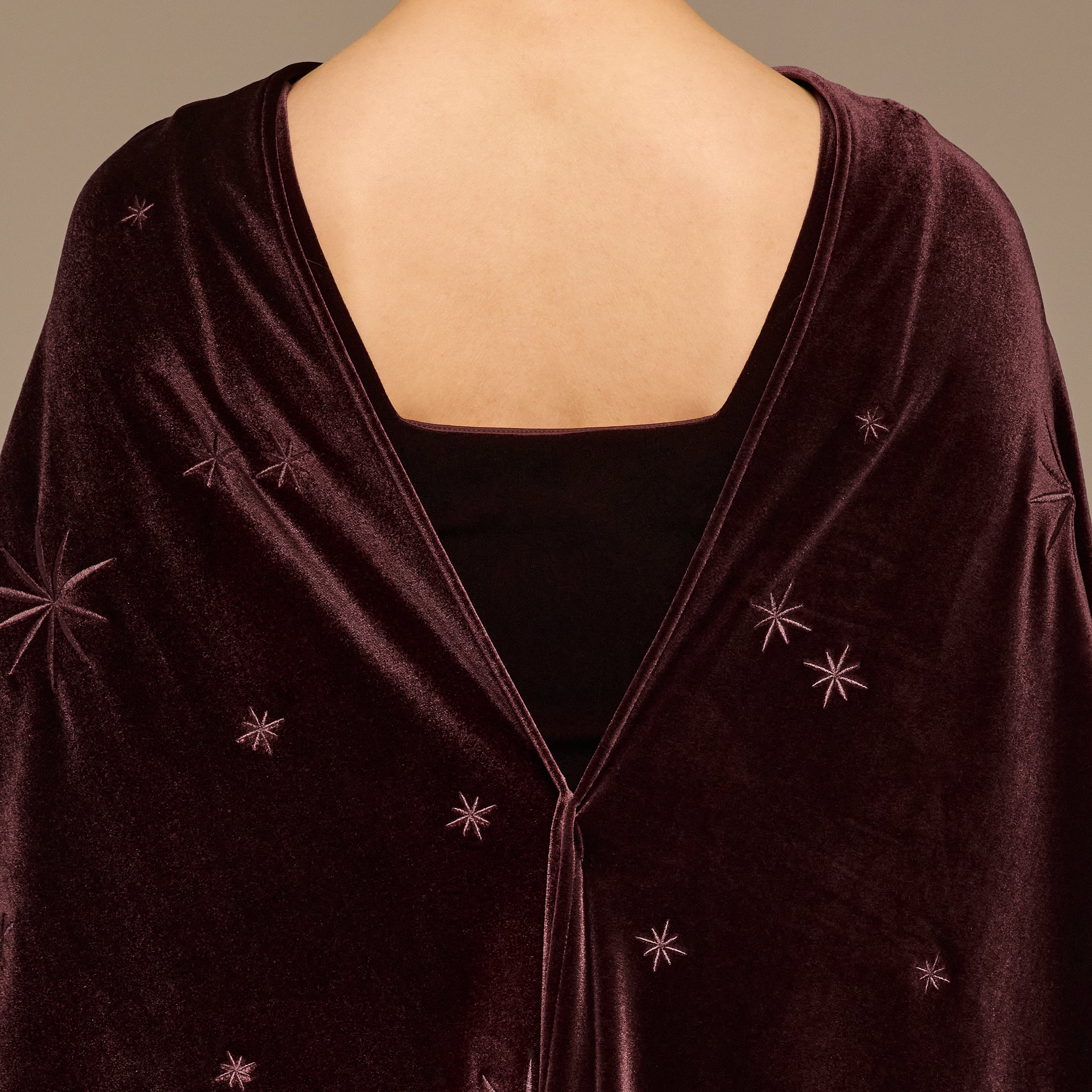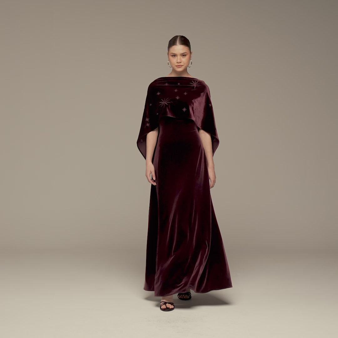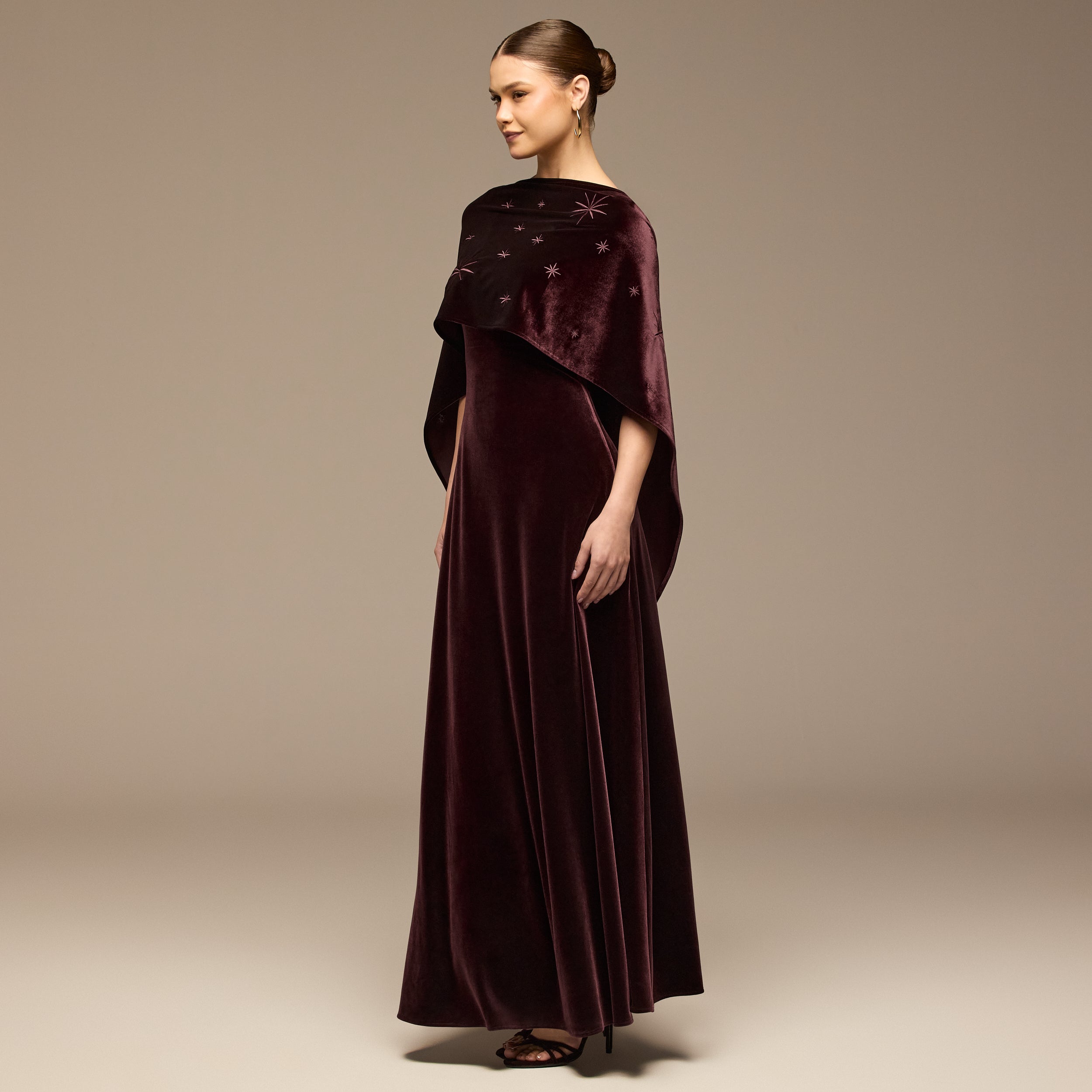 This two-piece velvet maxi dress offers elegance with flexibility. The sleeveless dress creates a smooth, flattering line, while the embroidered velvet shawl adds coverage and detail without feeling heavy. Designed for evenings where comfort matters as much as polish, it moves easily and feels confident from start to finish.