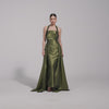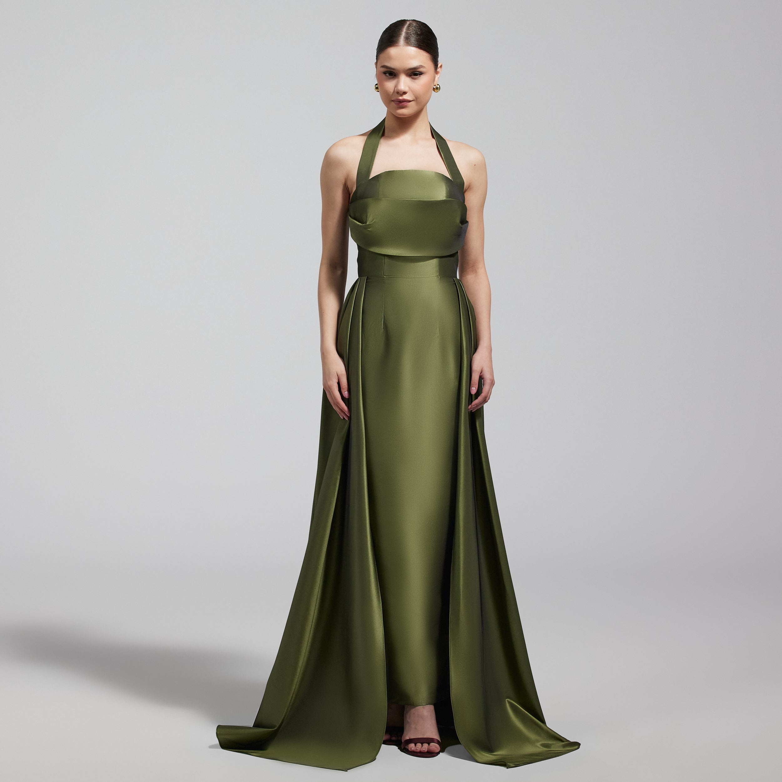 This taffeta gown is a great choice when you want something structured yet easy to wear. The fitted bodice gives gentle shape without feeling restrictive, while the long draped panel adds the kind of movement that feels elegant without effort. It’s a reliable option for formal dinners, engagements, or any occasion where you want a clean, polished look.
