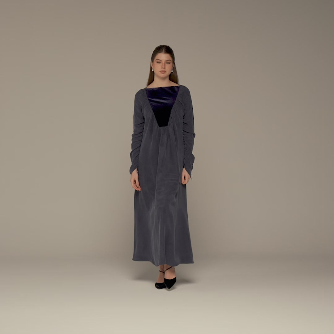 Elevate your wardrobe with this sophisticated navy cupro dress, where fluid elegance meets refined detail. The luxurious cupro fabric drapes beautifully, offering a soft, breathable comfort that moves with you throughout the day. Rich velvet panel accents add a touch of understated luxury and textural contrast, creating visual interest while maintaining an effortlessly polished aesthetic. Perfect for transitioning from professional settings to evening occasions, this versatile piece embodies timeless style with contemporary flair.