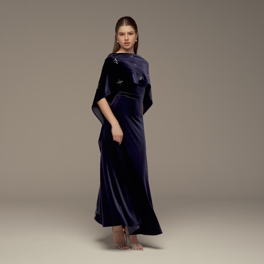 This two-piece velvet maxi dress offers elegance with flexibility. The sleeveless dress creates a smooth, flattering line, while the beaded velvet shawl adds coverage and detail without feeling heavy. Designed for evenings where comfort matters as much as polish, it moves easily and feels confident from start to finish.