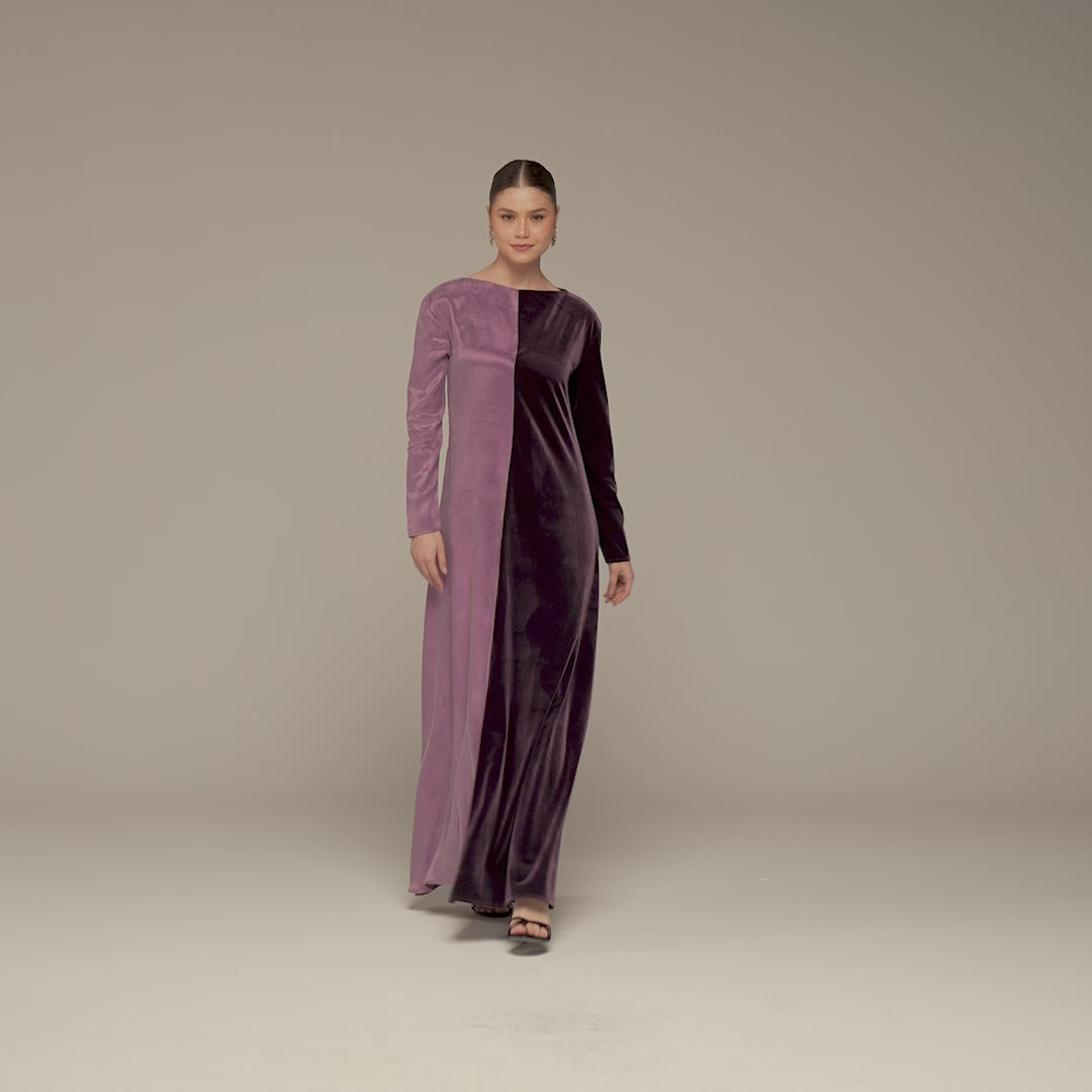 This two-tone maxi dress blends velvet and cupro for a soft contrast that feels rich yet easy to wear. The vertical color split creates a longer, cleaner line, while the relaxed cut allows comfortable movement through Ramadan evenings. Designed to look refined without feeling heavy.