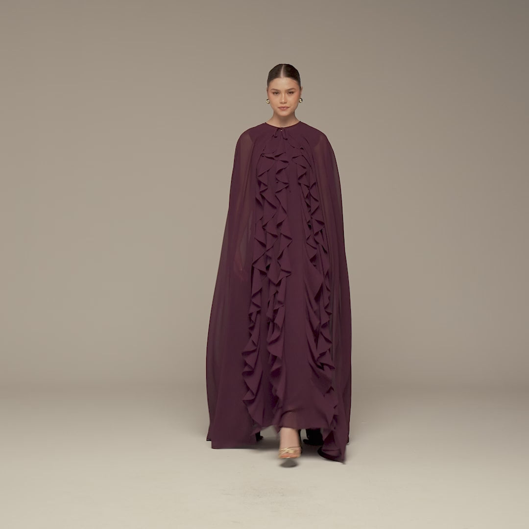 This chiffon ruffle maxi dress comes in two pieces, a sleeveless base dress and a flowing cape, giving you coverage without losing lightness. The front ruffle panels add movement and shape, making it an easy choice for Ramadan gatherings when you want something soft, feminine, and comfortable for long wear.