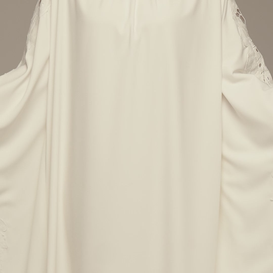 This white crepe maxi dress feels light and easy on the body, designed for days and evenings when you want comfort without losing elegance. The cut-out embroidery adds soft detail and airflow, while the relaxed silhouette allows free movement without clinging. A versatile piece for gatherings, Ramadan occasions, and refined daytime events.