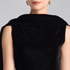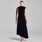 This dress is sleek with just the right amount of drama. The draped velvet bodice shapes the body without feeling restrictive, while an inverted pleat adds movement to the asymmetric hem. A back scarf flowing from one shoulder makes it stand out, yet it stays easy to wear for weddings, dinners, or formal evenings.
