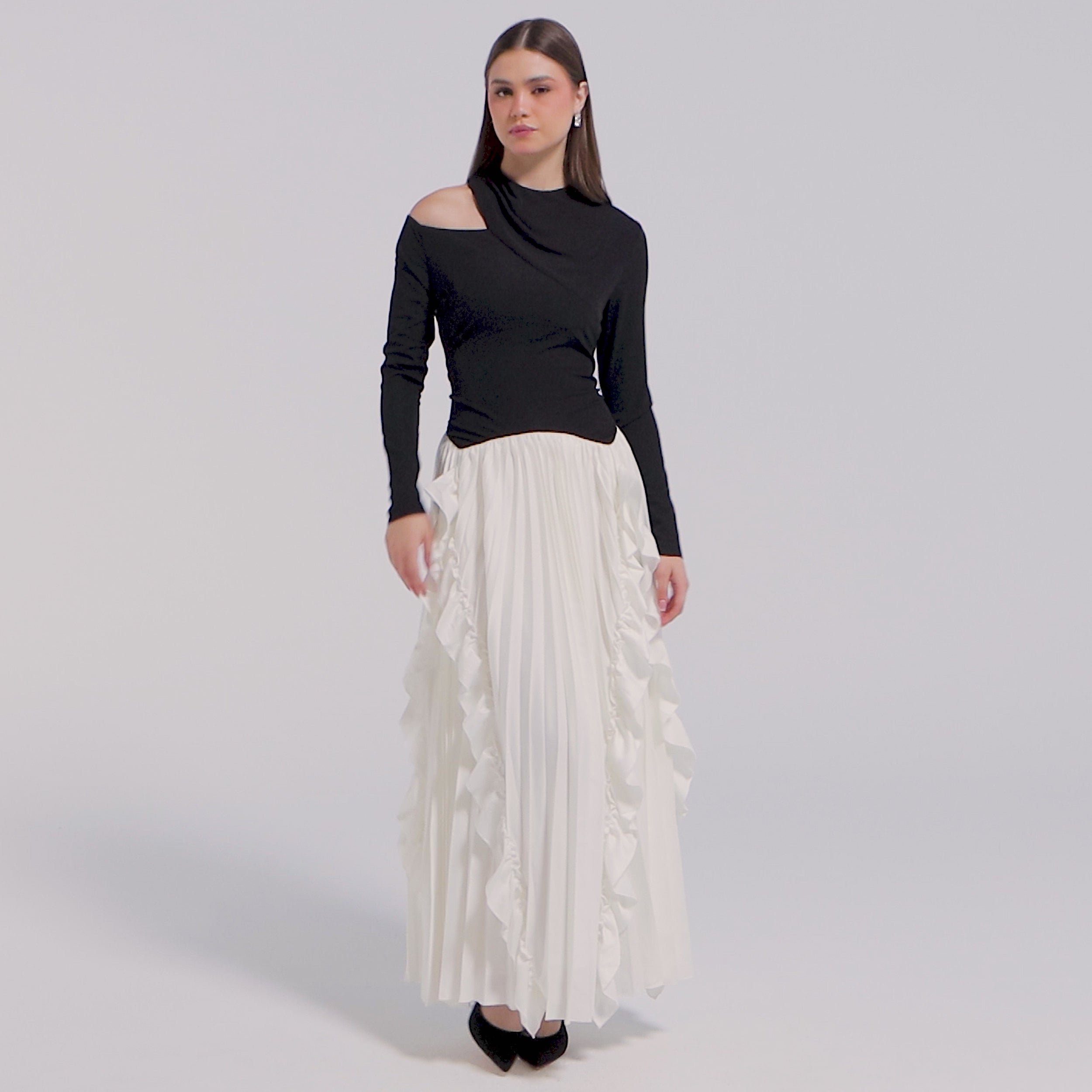 This draped jersey and satin pleated maxi dress combines soft texture with elegant movement. The fitted jersey top features an asymmetric off-shoulder neckline and long sleeves that create a sculpted, flattering shape. The satin skirt flows gracefully with soft pleats and cascading ruffles, offering effortless elegance for evening occasions or formal gatherings.