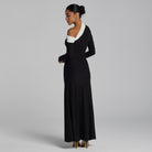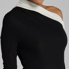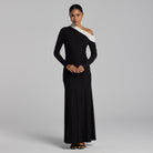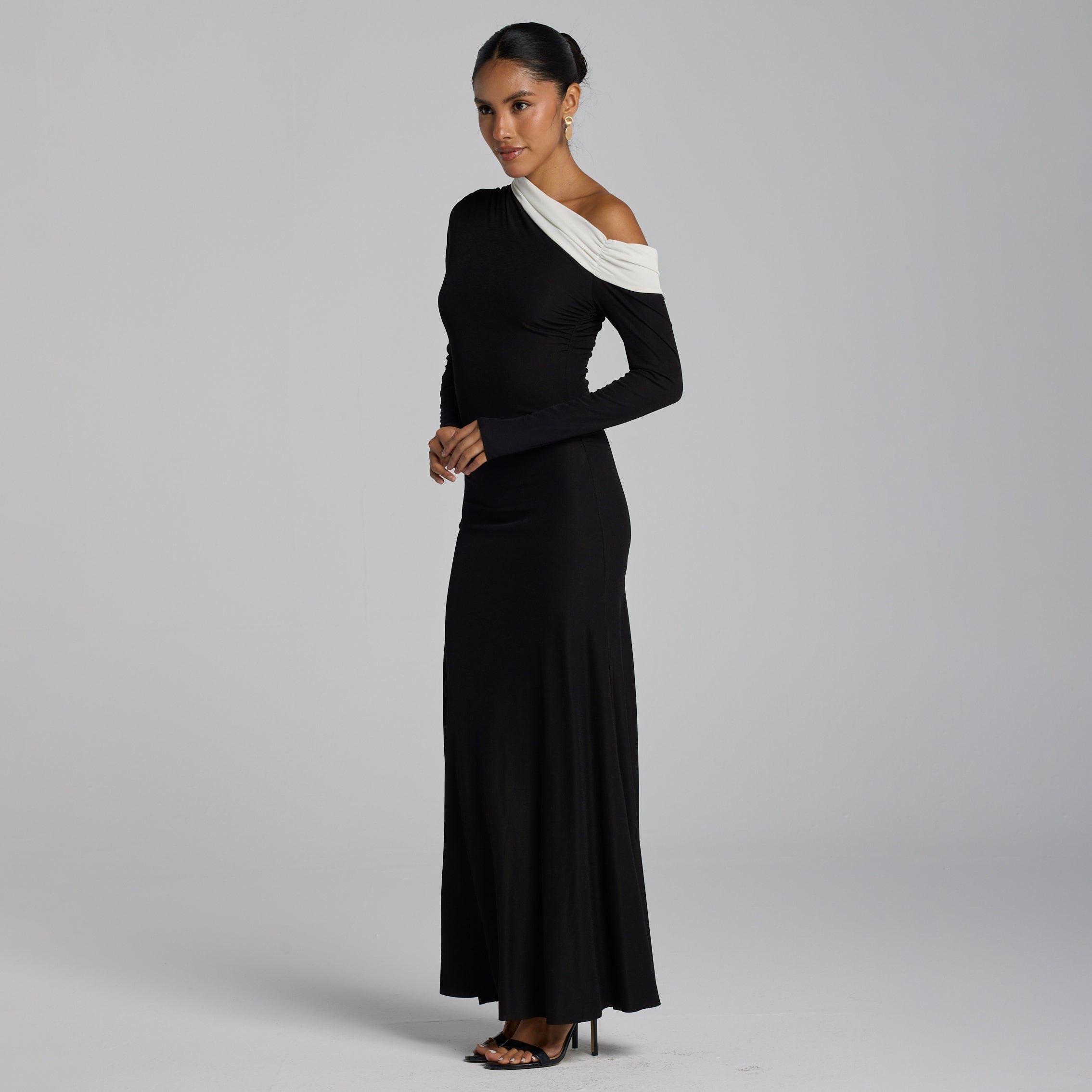 Made from soft jersey that gently follows your shape, this black and white off-shoulder ruched maxi dress drapes beautifully without feeling tight. The asymmetric neckline and ruched shoulder create a refined, flattering silhouette that feels as comfortable as it looks elegant – ideal for evening events, dinners, or special gatherings.
