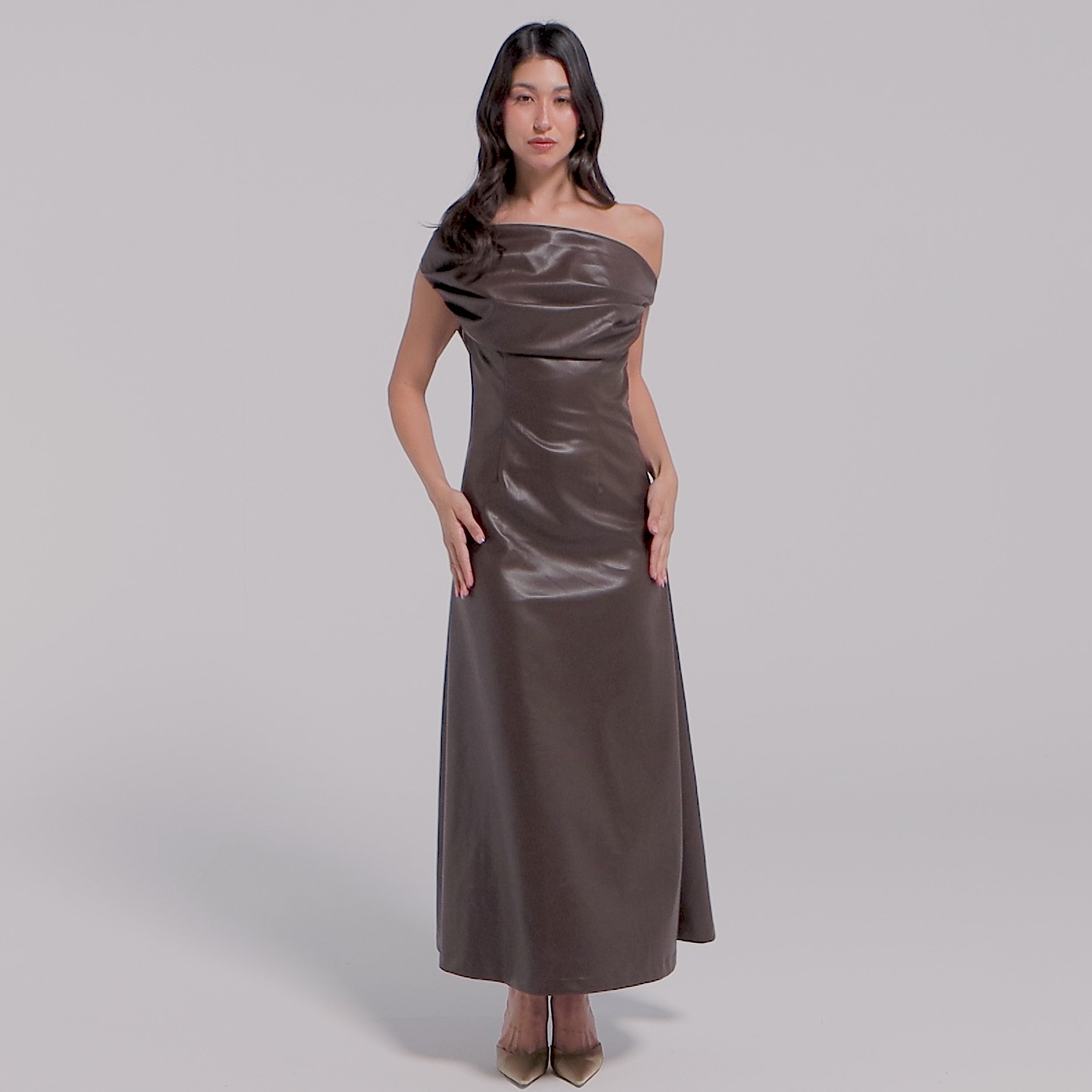 Brown Off Shoulder Draped Leather Midi Dress