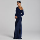 This asymmetric neckline tweed-satin dress blends texture and elegance effortlessly. The tweed top adds structure, while the soft satin skirt flows beautifully with every step. Designed with a fitted waist and flared skirt, it gives shape without feeling restrictive – ideal for special dinners or formal gatherings.