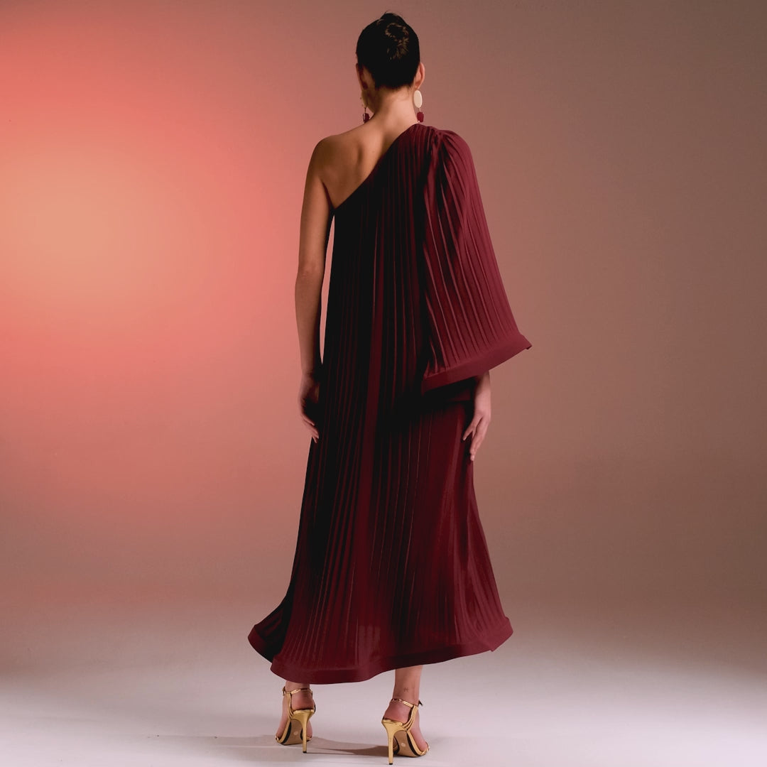 Experience elegance with our Pleated One Shoulder Long Sleeve Dress. The flawless pleats and one-shoulder design exude sophistication, giving you a tasteful and exclusive look. Perfect for any occasion, this dress will elevate your style and leave you looking flawless.