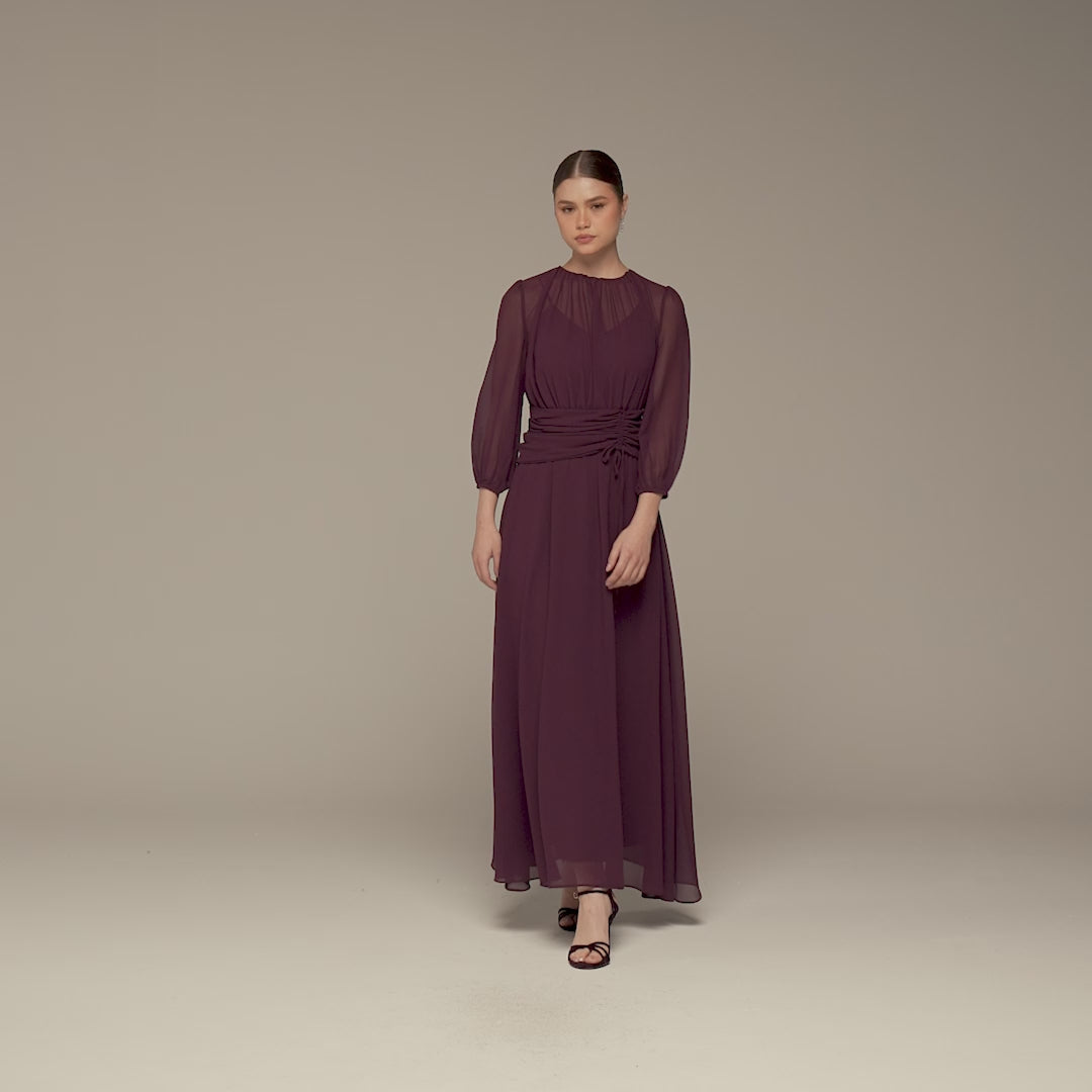 This chiffon maxi dress is designed with a softly ruched waist that shapes the figure without restricting movement. The lightweight chiffon flows gently from top to hem, creating a relaxed silhouette that feels comfortable all day. An easy choice for Eid gatherings when you want something light, modest, and polished.