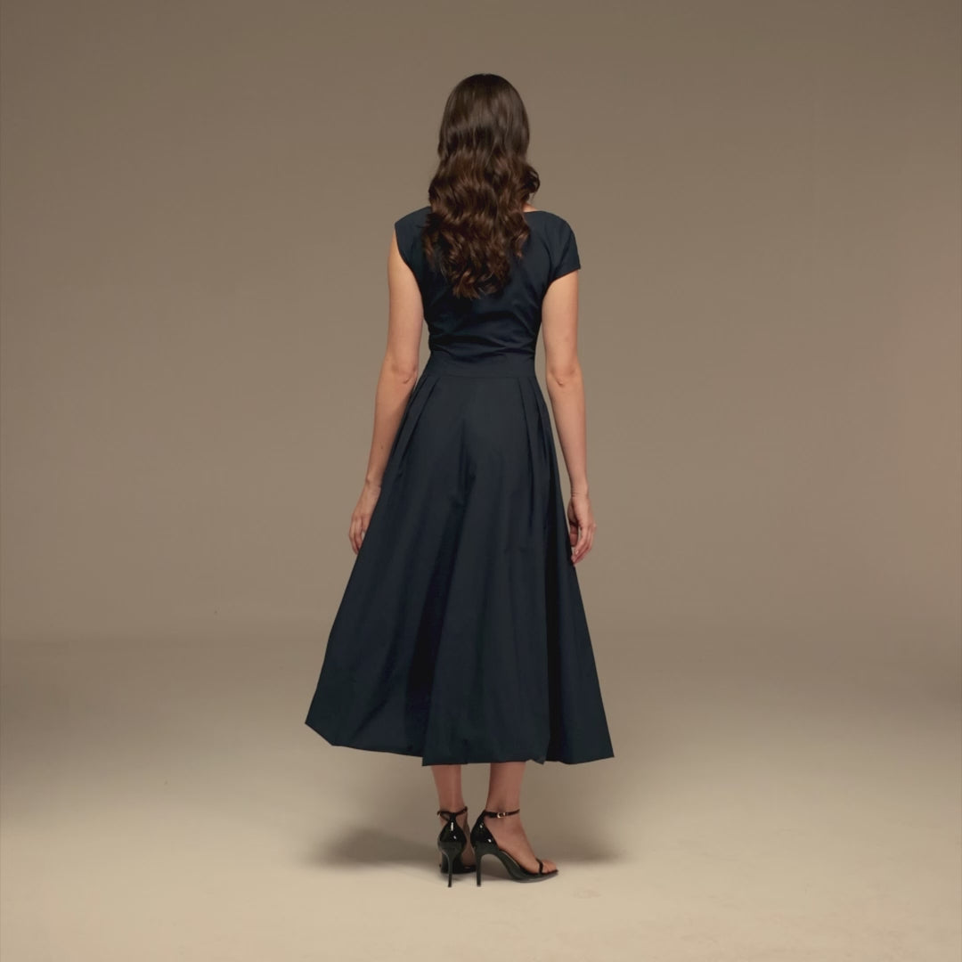 This midi dress is made from structured poplin with a short-sleeve bodice and a voluminous balloon skirt that holds its shape without stiffness. The boat neckline keeps the look open and balanced, while the fitted waist defines your shape. The playful hem gives the dress movement without needing extra styling.