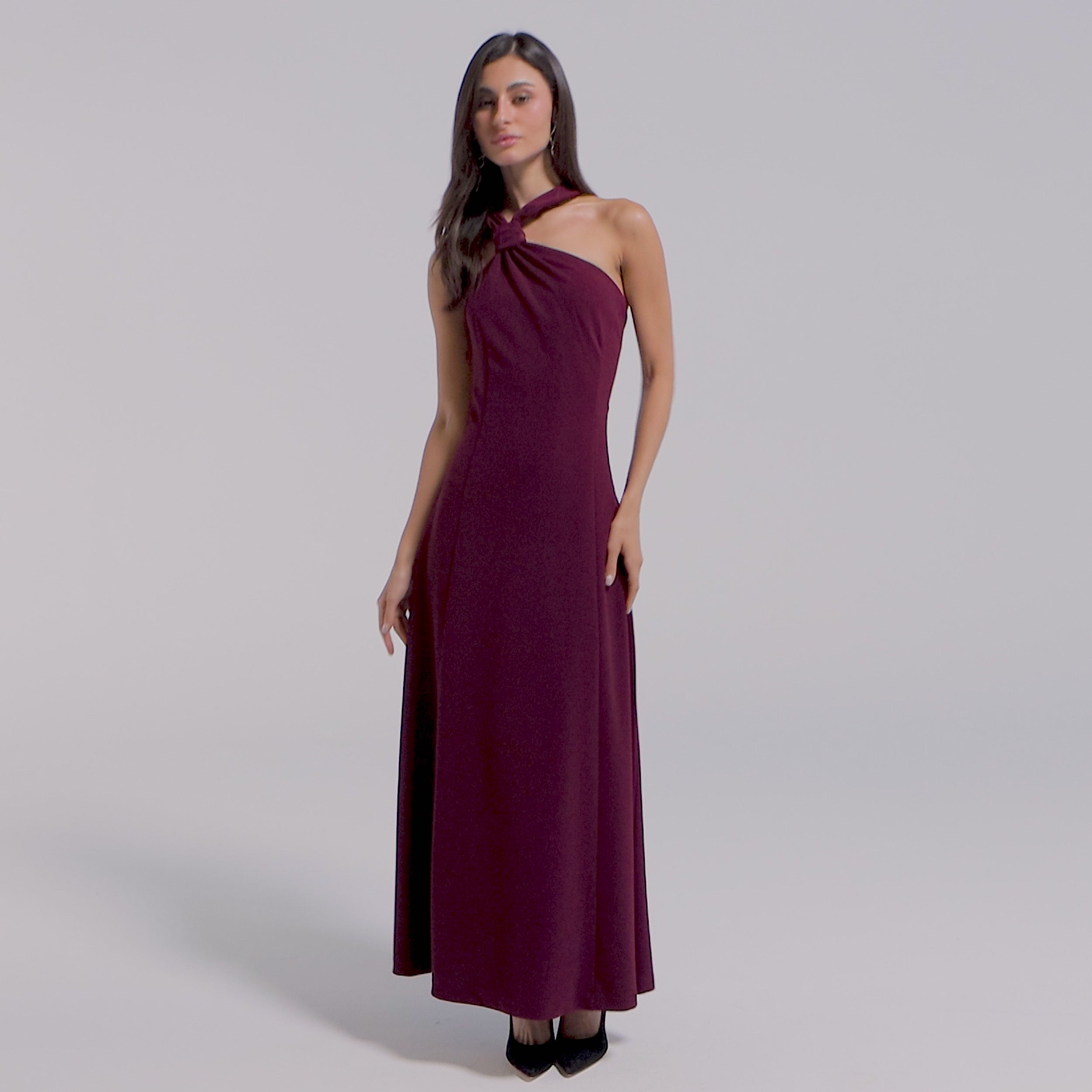 This burgundy crepe midi dress features a knot halter neckline and a softly flared silhouette. The flowing crepe fabric flatters the figure and moves with ease, making it a refined choice for evening occasions or elegant gatherings.