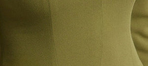 Crafted from crepe in a deep olive green shade, this maxi dress combines a fitted bodice with a straight cut for an elegant, elongating effect. The asymmetric neckline and subtle chest cutout add a modern edge, while the long sleeves with wide hems offer coverage without compromising style. Ideal for evening gatherings or formal dinners.