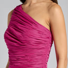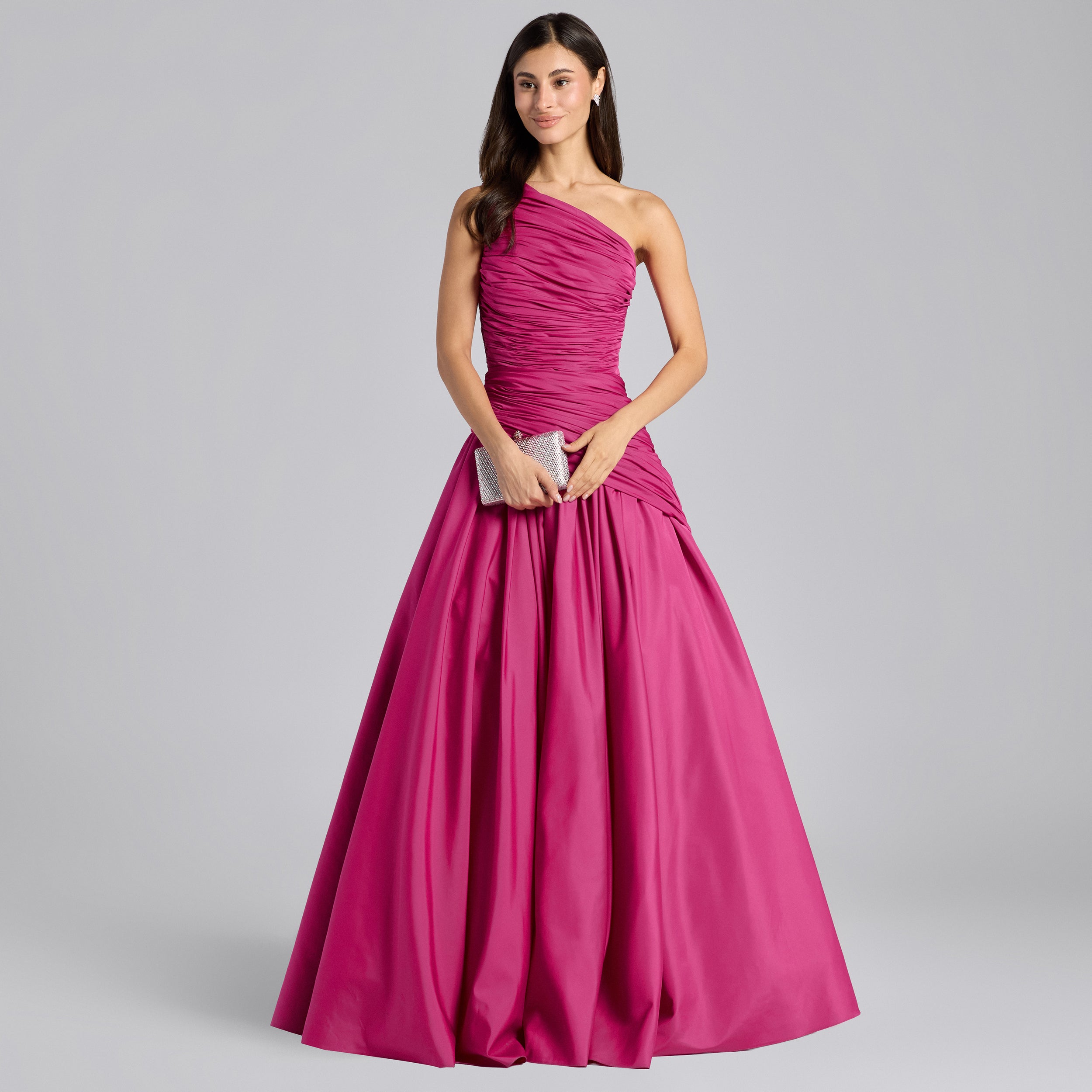 This gown feels striking yet comfortable. The ruched one-shoulder bodice shapes the waist without being restrictive, while the draped detailing flows into a full skirt that moves easily. Its fitted top and fluid base make it a confident choice for weddings, engagement dinners, or formal evenings.