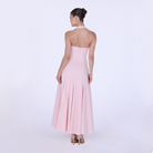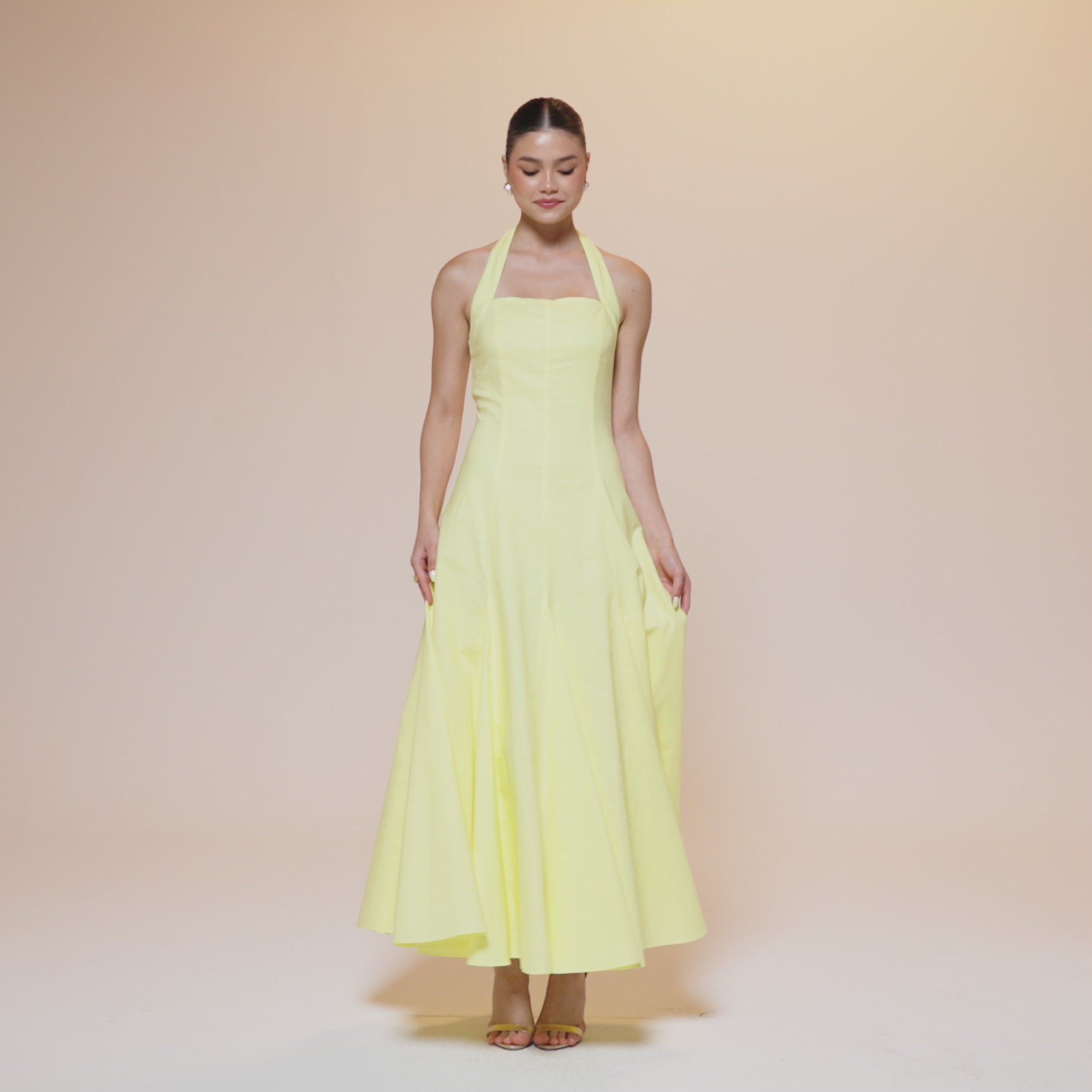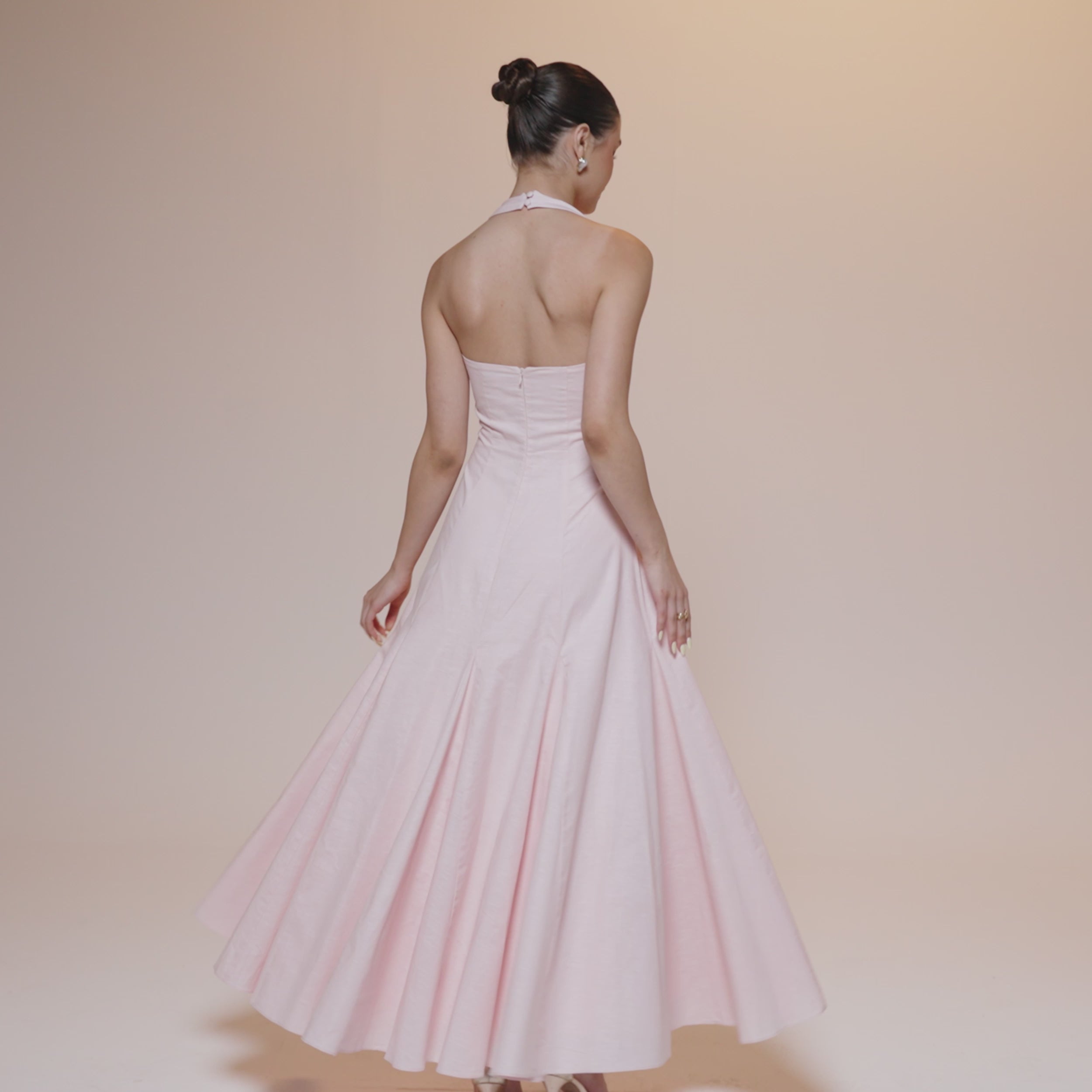 The Flared Linen Halter Neck Maxi Dress from our Summer 2025 Collection. Crafted from breathable linen, this maxi silhouette features a classic halter neckline and a softly flared hem that moves with ease.