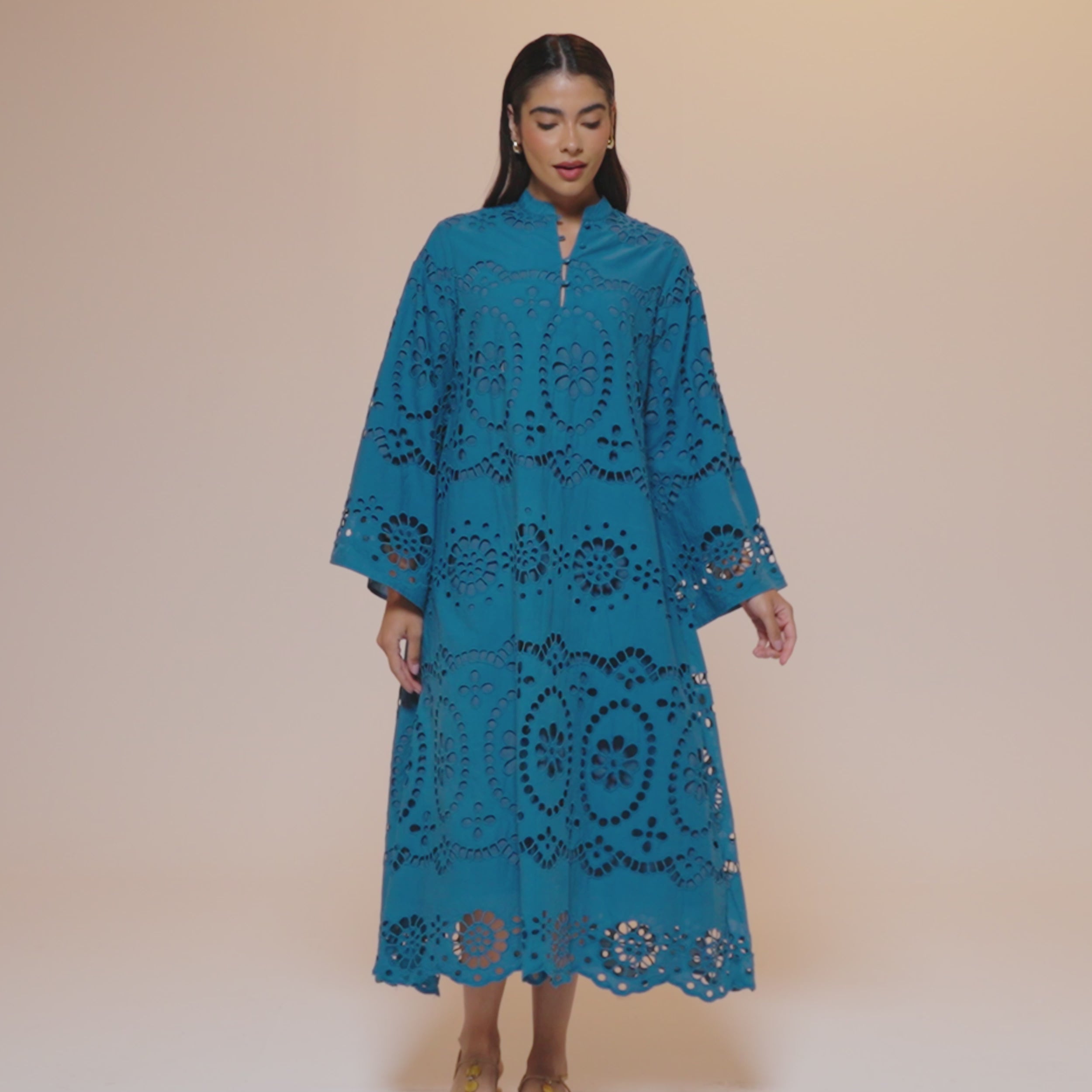The Tonal Cotton Wide Sleeve Midi Dress from our Summer 2025 Collection. Crafted from cotton eyelet fabric with a scalloped edge, and lined in tonal cotton, this dress features a Mandarin collar and fabric-covered buttons for a refined finish.