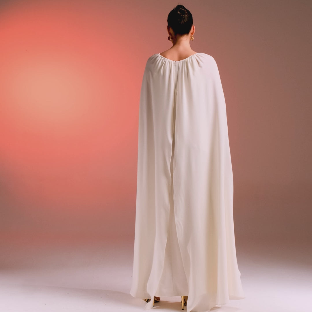 Indulge in luxury with our Bodycon Crepe Dress, featuring a sleek and sophisticated cape effect. Crafted from high-quality crepe fabric, this kaftan is designed to hug your curves and accentuate your silhouette. Adorned with gold accessories on the hem, this elegant piece is the epitome of exclusivity. Elevate your wardrobe with this must-have statement piece.