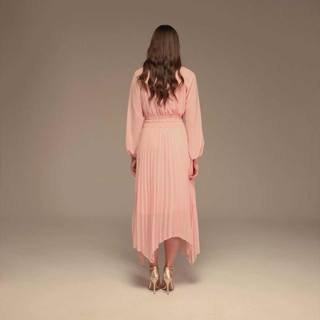 The Chiffon Pleated Midi Dress brings refined fluidity to every step. Designed with soft pleats throughout and a boat neckline for a polished finish, it features a wispy handkerchief hemline that adds lightness and flow.