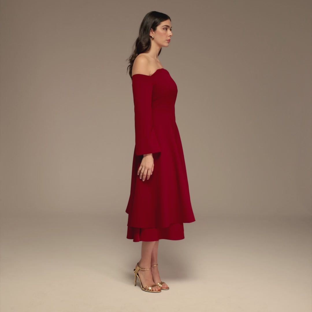 Crafted from structured crepe, this off-shoulder midi dress balances softness and structure with its long sleeves and flared layered skirt. A sheer organza panel at the hem adds lightness and movement, while princess seams contour the bodice with clean lines and no tightness.