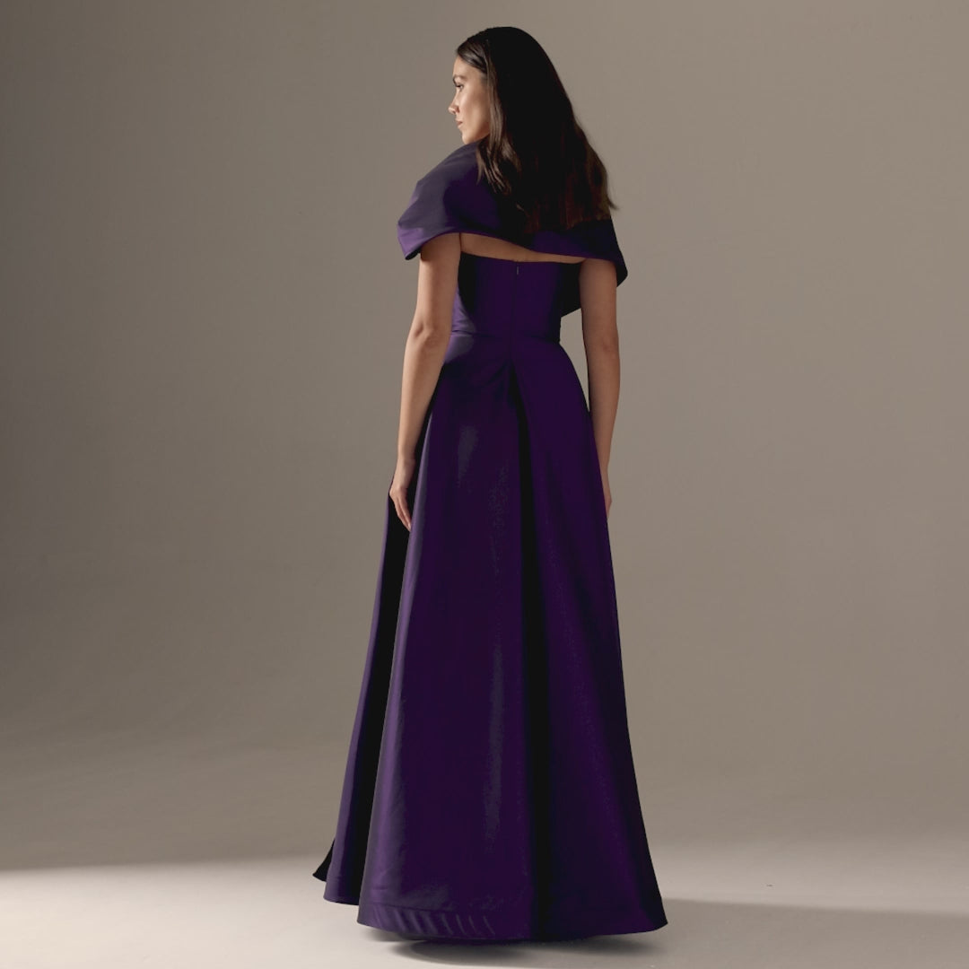 Elevate your style with our Off Shoulder Taffeta Maxi Dress. Its elegant design features a classic off-shoulder neckline and luxurious taffeta fabric for a classy and sophisticated look. Perfect for any occasion, this dress will have you feeling elegant and exclusive.