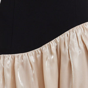 This black crepe midi dress adds an unexpected twist with layered off-white organza ruffles at the hem. The structured bodice shapes the waist, while the flared hem offers movement and ease. Sleeveless with a classic round neckline, it's a piece that blends minimalism with subtle volume.