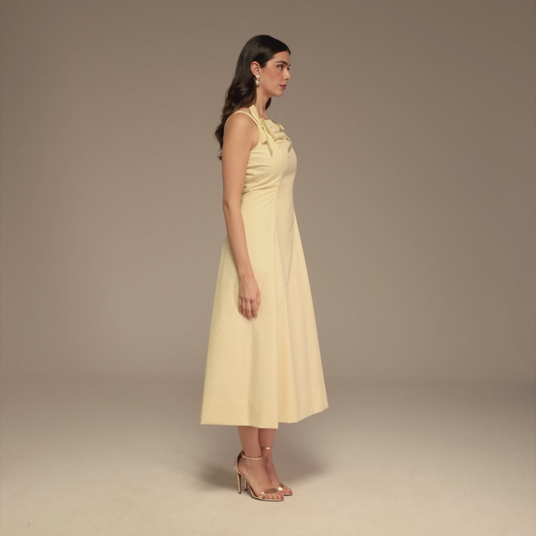 This sleeveless poplin dress offers a light, airy feel with gathered details that soften the chest. The straps are finished with delicate decorative ties that add movement without excess. A round open back gives a relaxed finish, balanced by the crisp A-line shape that flows without clinging.