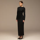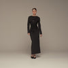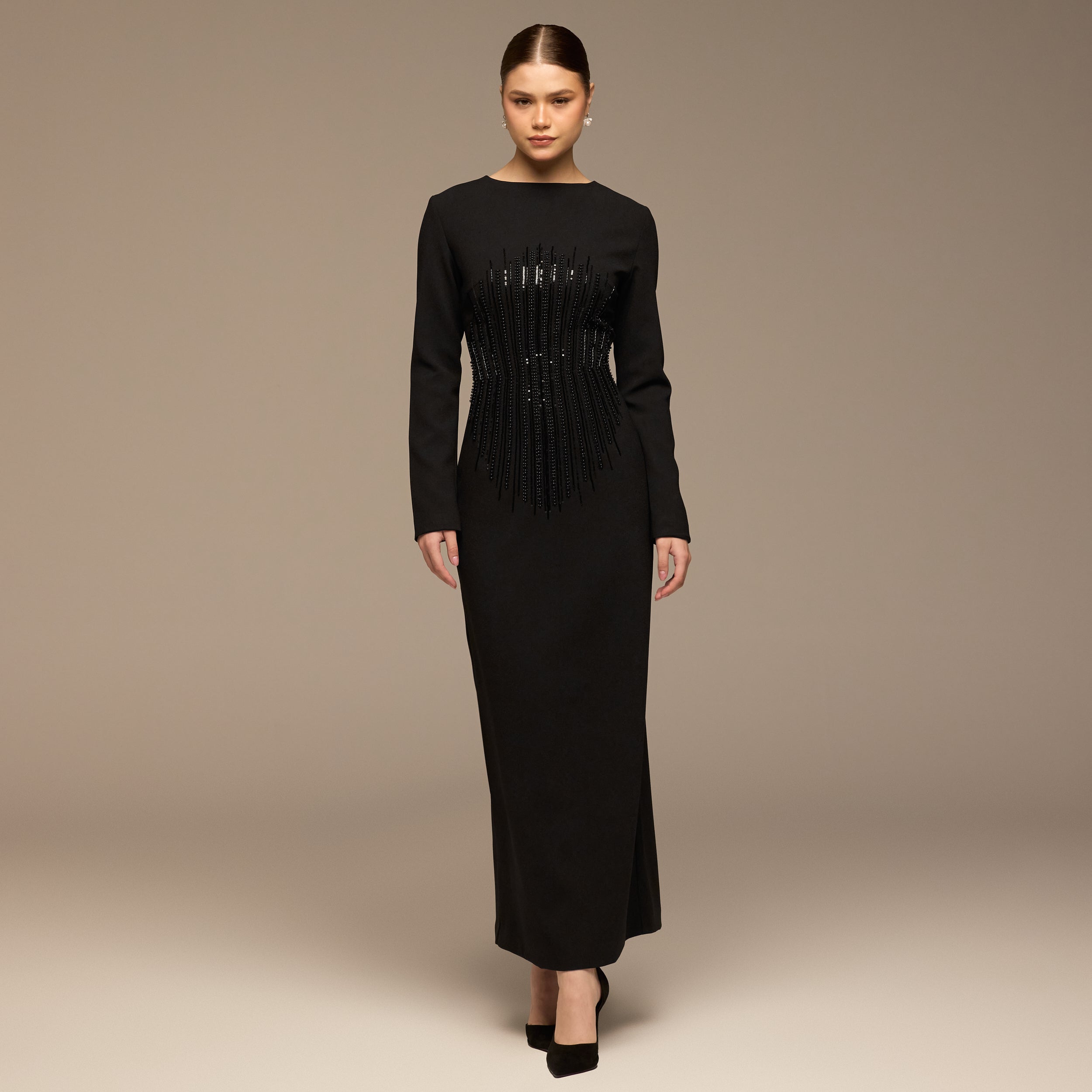 This black crepe maxi dress is designed to feel smooth and comfortable while keeping a clean, elegant line. The sequined panel adds subtle shine that draws the eye without overwhelming the look, while the long silhouette creates a refined, confident feel. Ideal for evening events and formal occasions when you want polish with a touch of detail.