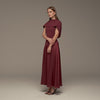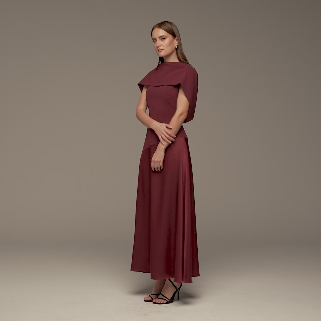 This off-shoulder maxi dress pairs a structured crepe bodice with a smooth satin skirt, giving a balanced look that feels elegant without being restrictive. The crepe top provides gentle support, while the satin falls softly for a flattering, lengthening effect.